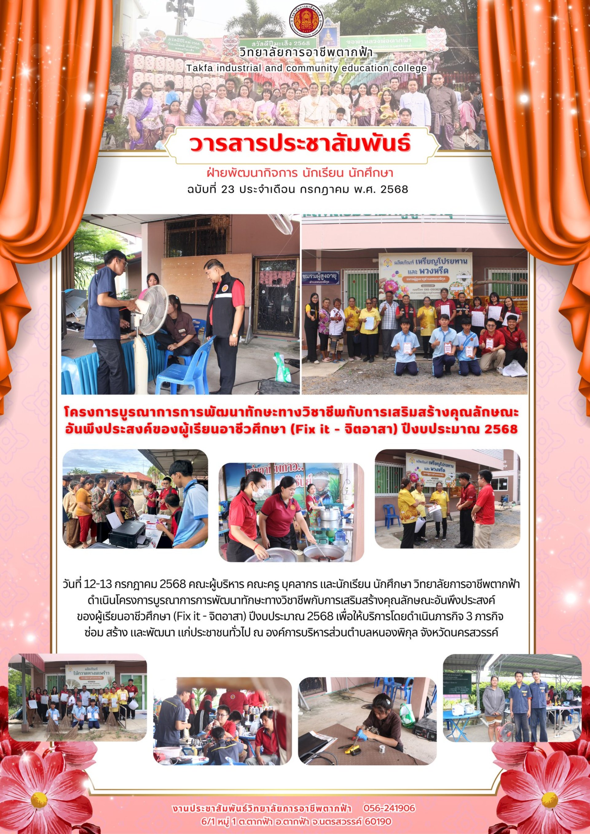 วารสารตากฟ้า ประจำเดือน กรกฎาคม 2568 ฉบับที่ 23 โครงการบูรณาการการพัฒนาทักษะทางวิชาชีพกับการเสริมสร้างคุณลักษณะอันพึงประสงค์ของผู้เรียนอาชีวศึกษา (Fix it - จิตอาสา) ปีงบประมาณ 2568 วันที่ 12-13 กรกฎาคม 2568