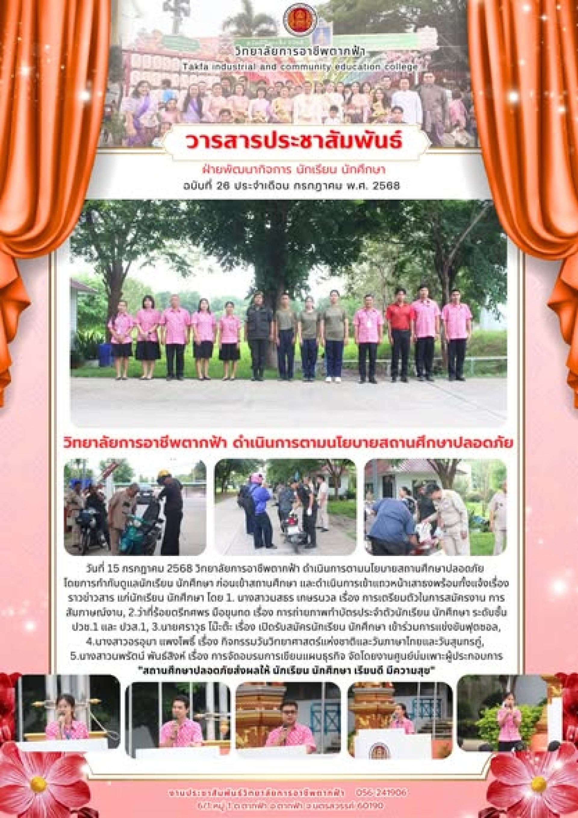 วารสารตากฟ้า ประจำเดือน กรกฎาคม 2568 ฉบับที่ 26 วิทยาลัยการอาชีพตากฟ้า ดำเนินการตามนโยบายสถานศึกษาปลอดภัย