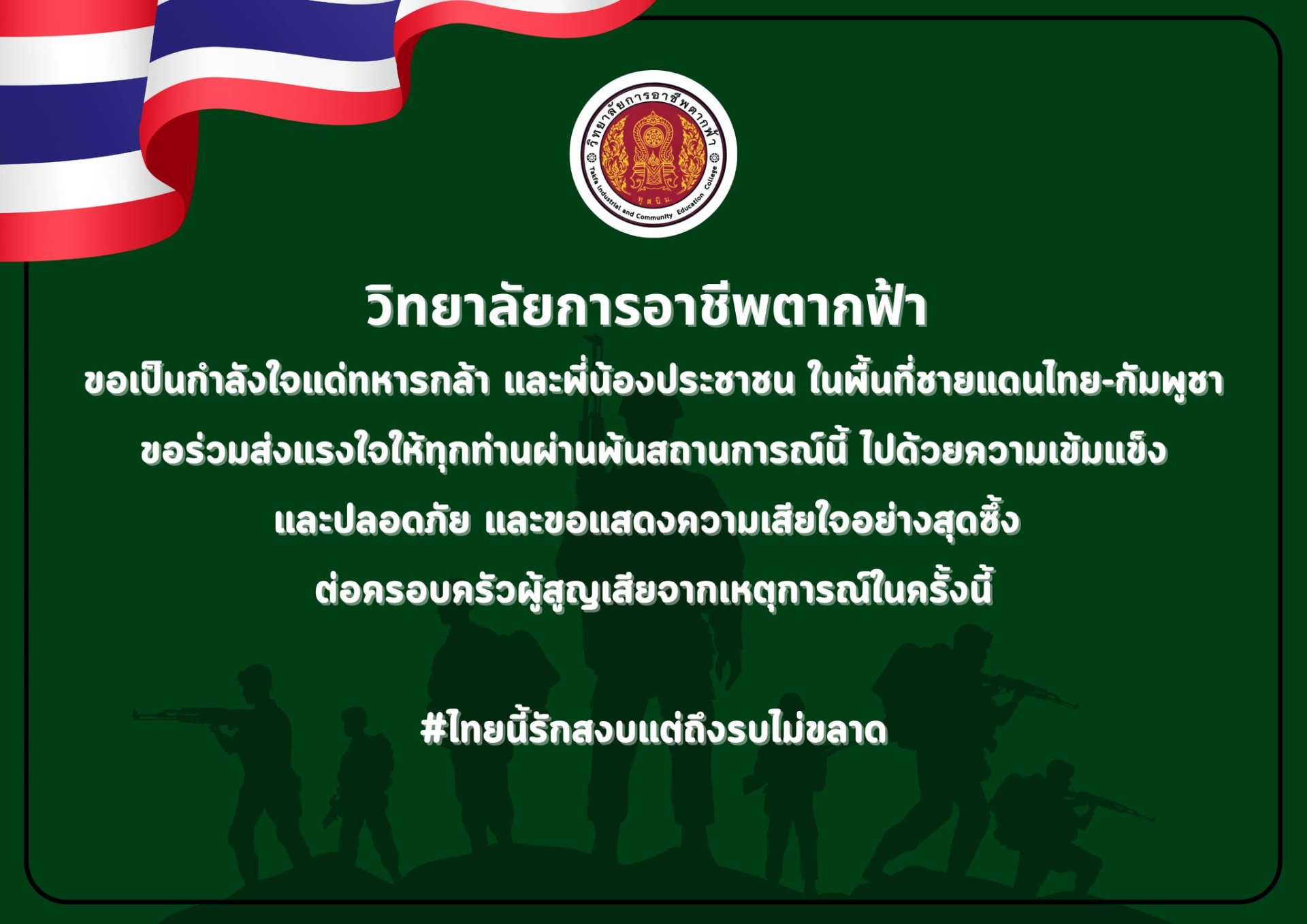 "วิทยาลัยการอาชีพตากฟ้า" ขอเป็นกำลังใจแด่ทหารกล้า และพี่น้องประชาชน ในพื้นที่ชายแดนไทย-กัมพูชา ขอร่วมส่งแรงใจให้ทุกท่านผ่านพ้นสถานการณ์นี้ ไปด้วยความเข้มแข็งและปลอดภัย และขอแสดงความเสียใจอย่างสุดซึ้ง ต่อครอบครัวผู้สูญเสียจากเหตุการณ์ในครั้งนี้