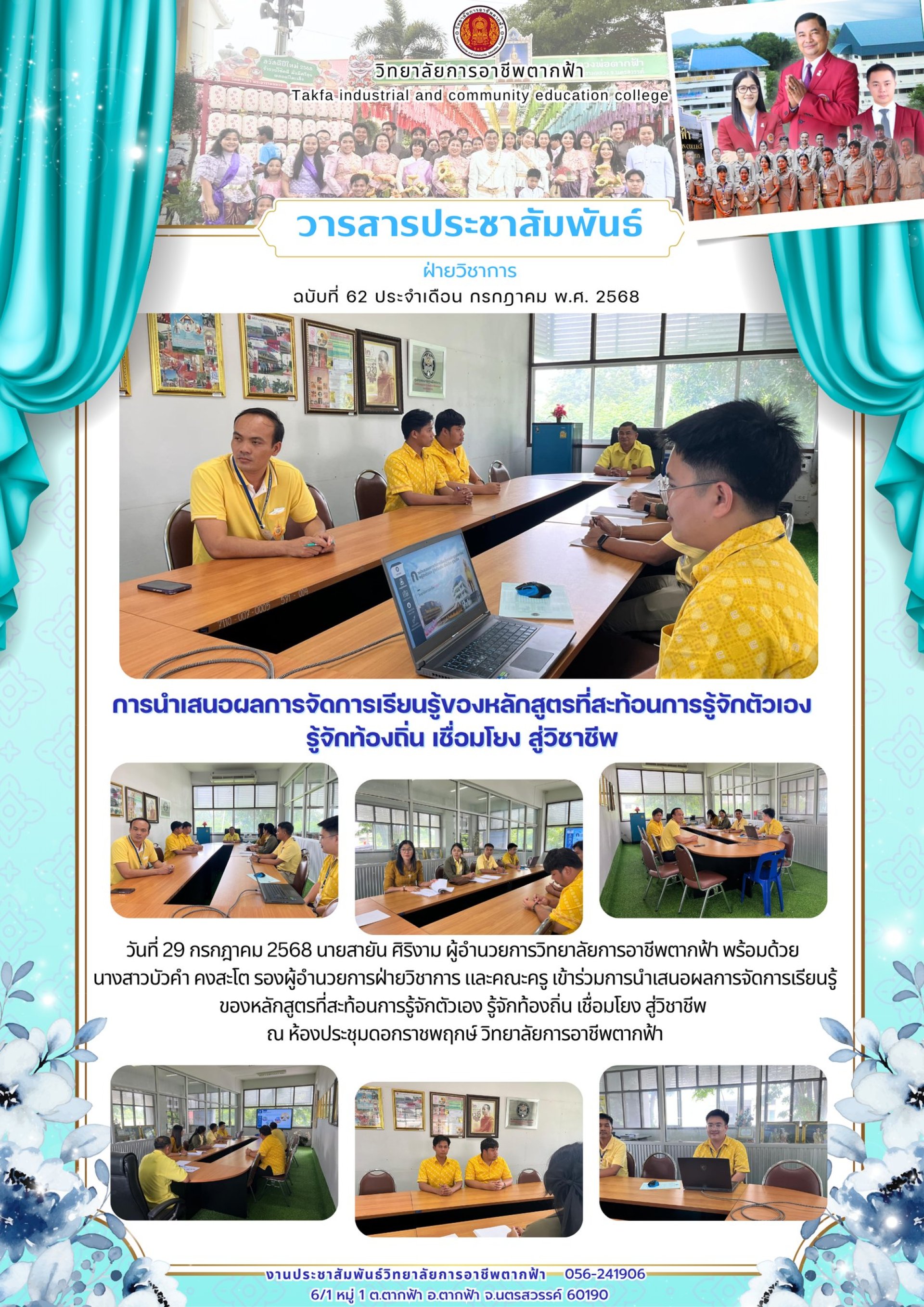 วารสารตากฟ้า ประจำเดือน กรกฎาคม 2568 ฉบับที่ 62 การนำเสนอผลการจัดการเรียนรู้ของหลักสูตรที่สะท้อนการรู้จักตัวเอง รู้จักท้องถิ่น เชื่อมโยง สู่วิชาชีพ