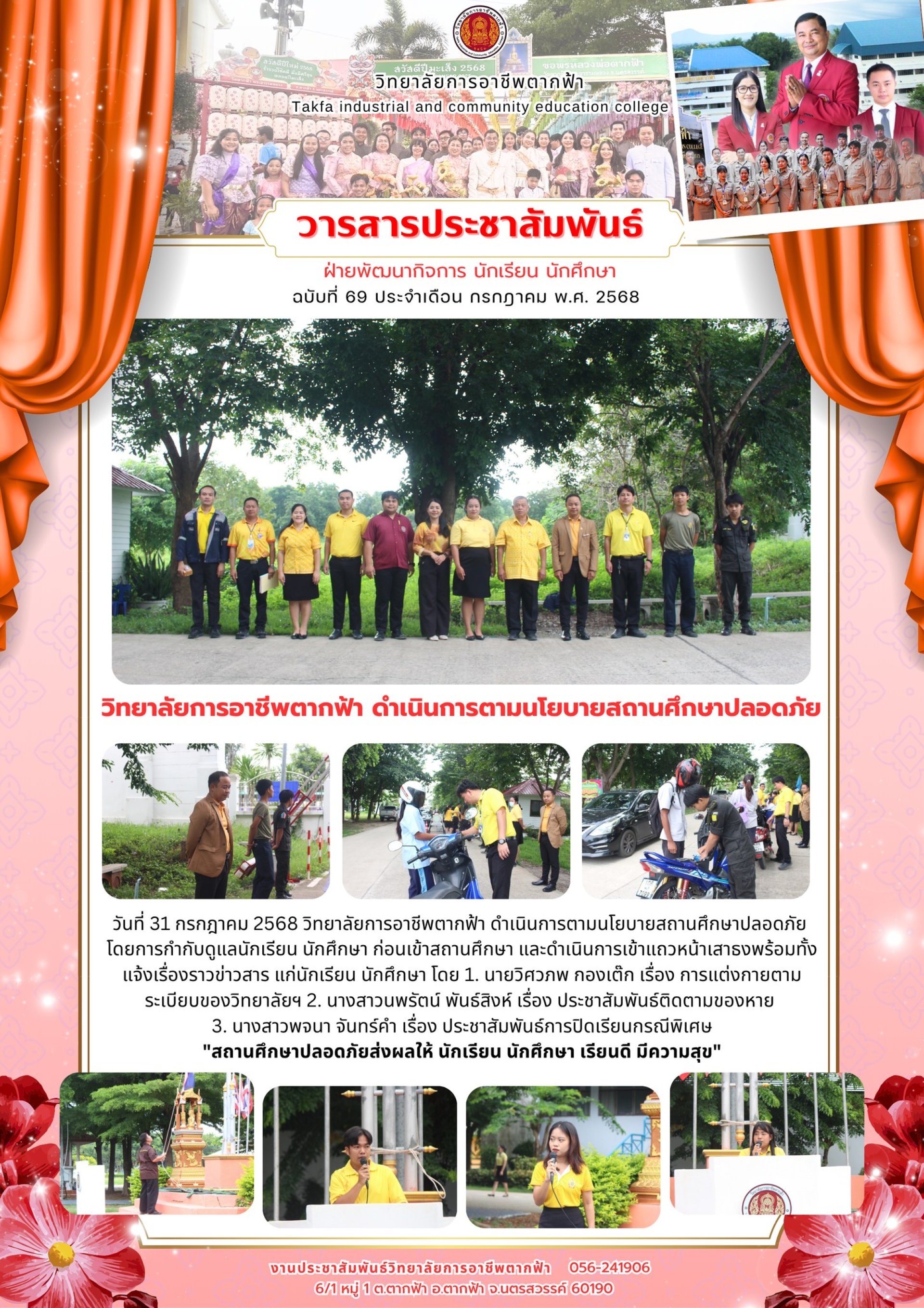 วารสารตากฟ้า ประจำเดือน กรกฎาคม 2568 ฉบับที่ 69 วิทยาลัยการอาชีพตากฟ้า ดำเนินการตามนโยบายสถานศึกษาปลอดภัย