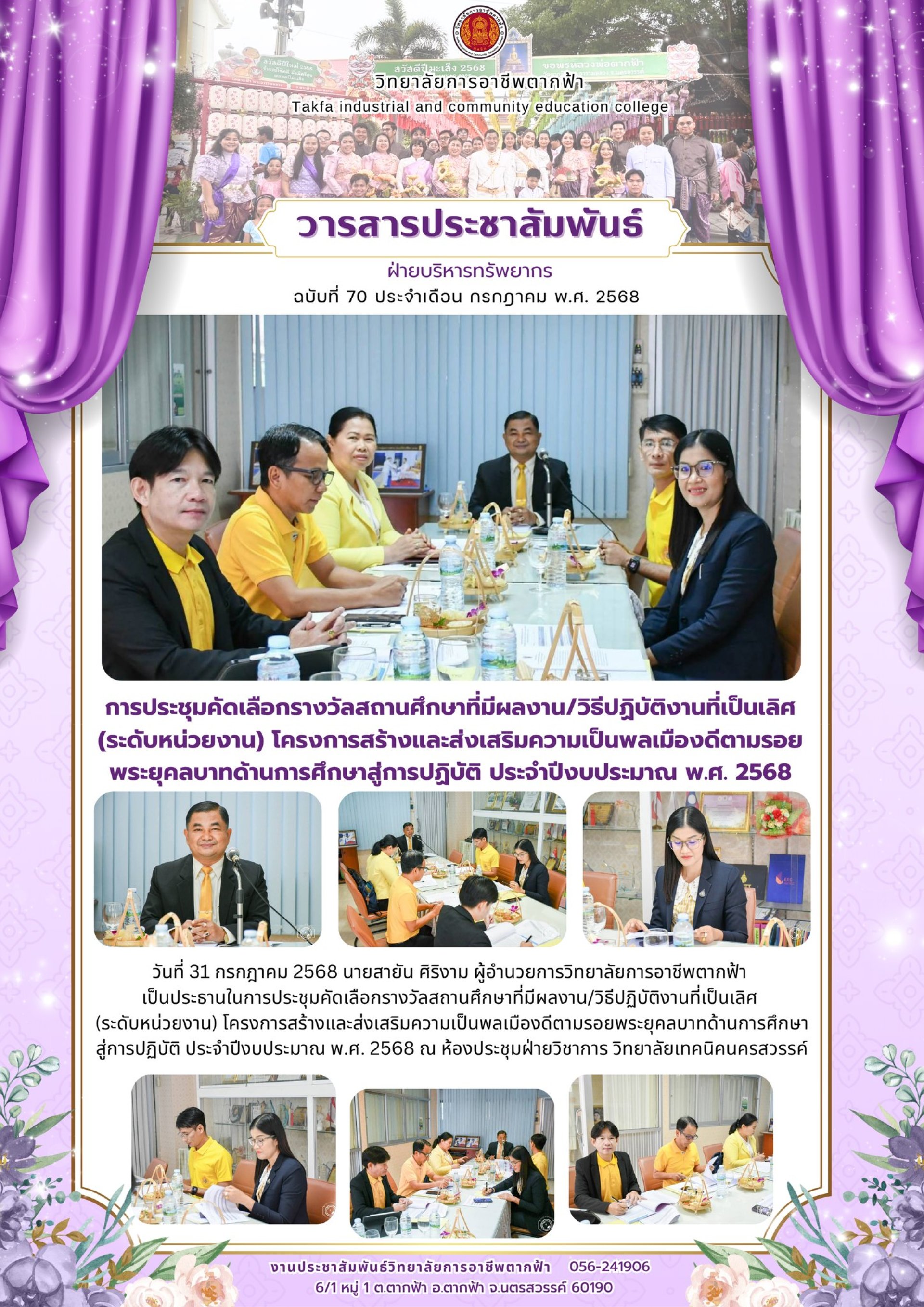 วารสารตากฟ้า ประจำเดือน กรกฎาคม 2568 ฉบับที่ 70 การประชุมคัดเลือกรางวัลสถานศึกษาที่มีผลงาน/วิธีปฏิบัติงานที่เป็นเลิศ (ระดับหน่วยงาน) โครงการสร้างและส่งเสริมความเป็นพลเมืองดีตามรอยพระยุคลบาทด้านการศึกษาสู่การปฏิบัติ ประจำปีงบประมาณ พ.ศ. 256