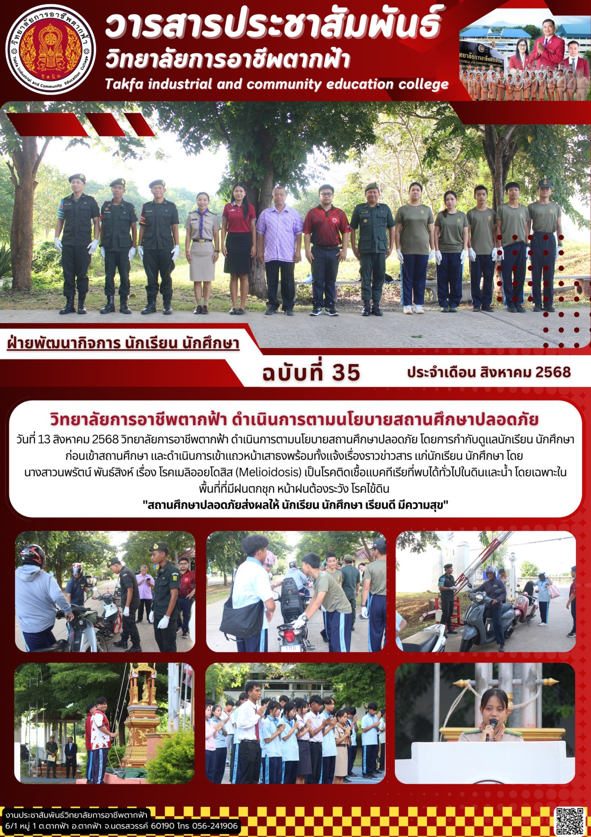 วารสารตากฟ้า ประจำเดือน สิงหาคม 2568 ฉบับที่ 35 วิทยาลัยการอาชีพตากฟ้า ดำเนินการตามนโยบายสถานศึกษาปลอดภัย