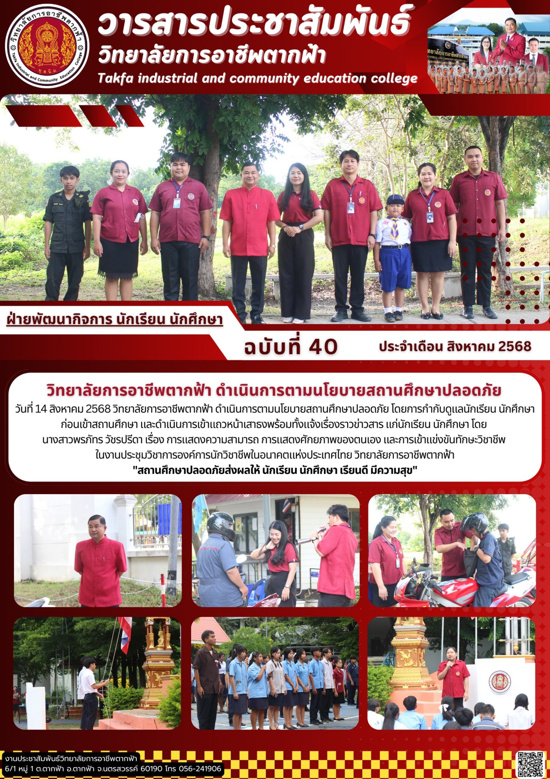 วารสารตากฟ้า ประจำเดือน สิงหาคม 2568 ฉบับที่ 40 วิทยาลัยการอาชีพตากฟ้า ดำเนินการตามนโยบายสถานศึกษาปลอดภัย