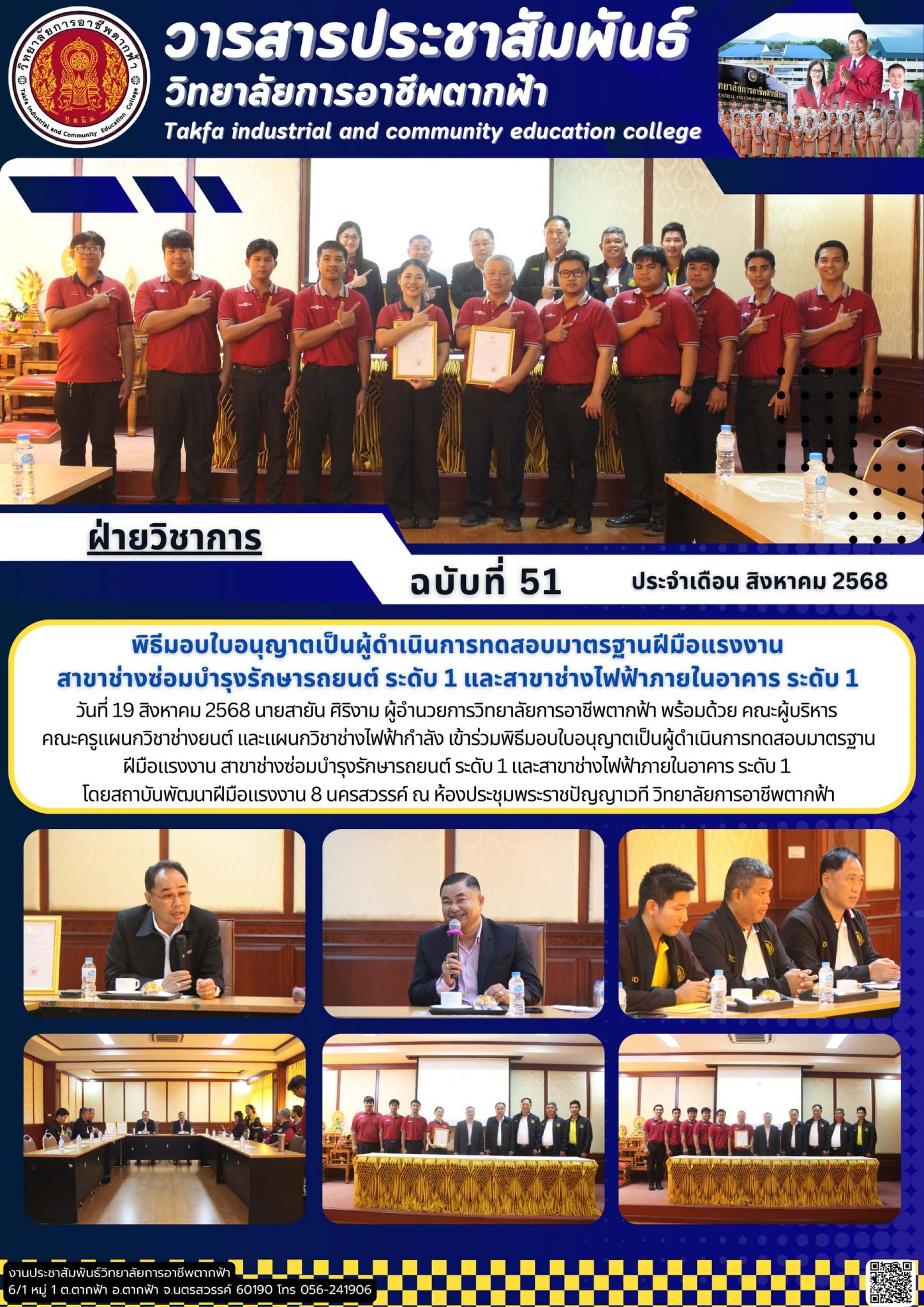 วารสารตากฟ้า ประจำเดือน สิงหาคม 2568 ฉบับที่ 51 พิธีมอบใบอนุญาตเป็นผู้ดำเนินการทดสอบมาตรฐานฝีมือแรงงาน สาขาช่างซ่อมบำรุงรักษารถยนต์ ระดับ 1 และสาขาช่างไฟฟ้าภายในอาคาร ระดับ 1