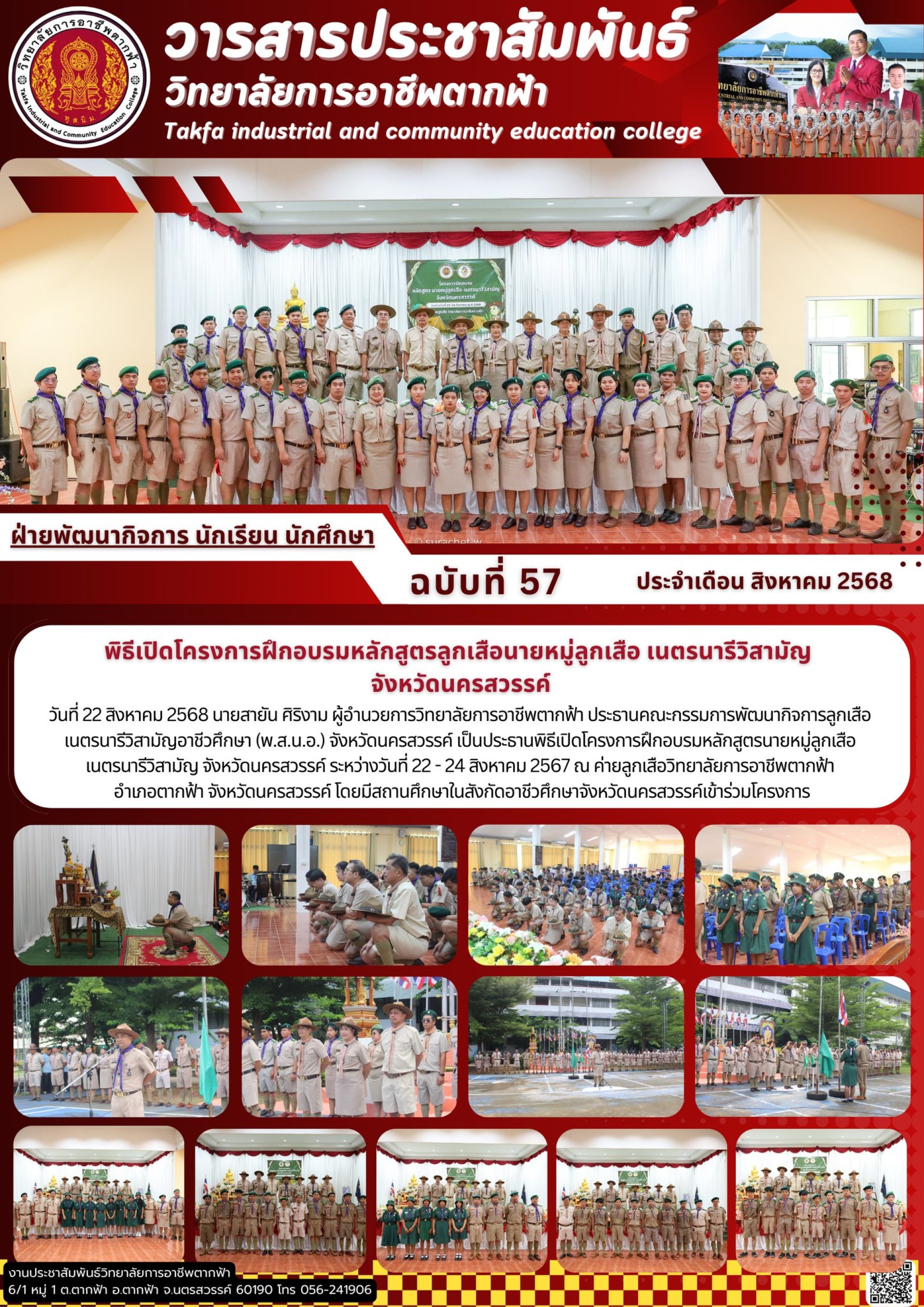 วารสารตากฟ้า ประจำเดือน สิงหาคม 2568 ฉบับที่ 57 พิธีเปิดโครงการฝึกอบรมหลักสูตรลูกเสือนายหมู่ลูกเสือ เนตรนารีวิสามัญ จังหวัดนครสวรรค์