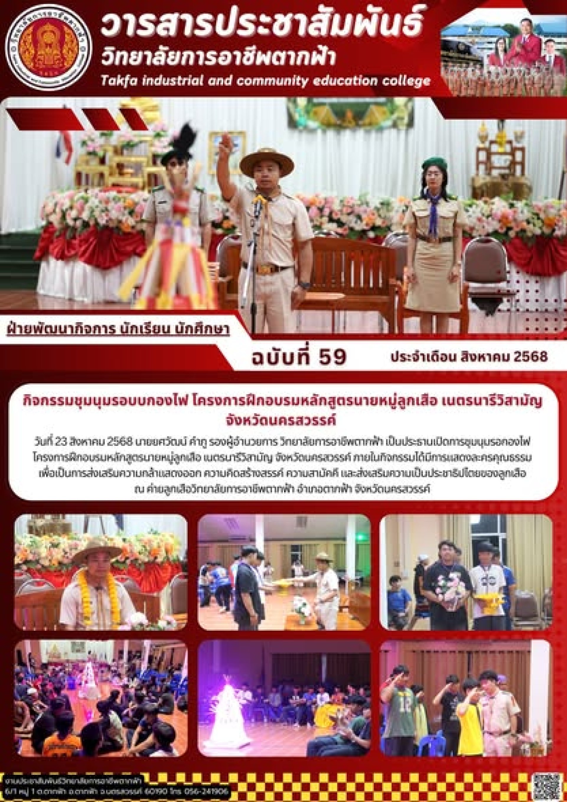 วารสารตากฟ้า ประจำเดือน สิงหาคม 2568 ฉบับที่ 59 กิจกรรมชุมนุมรอบบกองไฟ โครงการฝึกอบรมหลักสูตรนายหมู่ลูกเสือ เนตรนารีวิสามัญจังหวัดนครสวรรค์