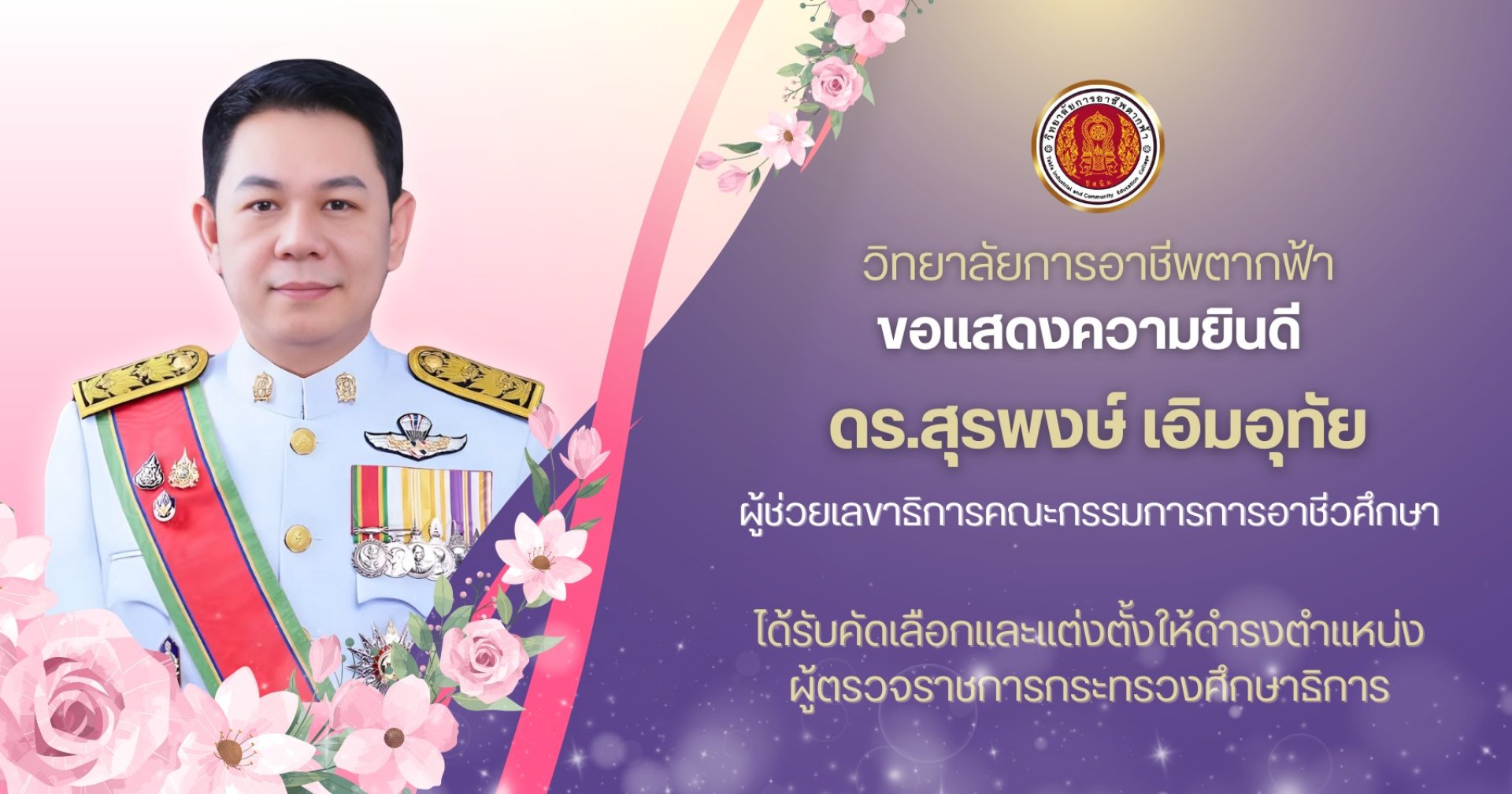 วิทยาลัยการอาชีพตากฟ้า ขอแสดงความยินดีกับ ดร.สุรพงษ์ เอิมอุทัย ผู้ช่วยเลขาธิการคณะกรรมการการอาชีวศึกษา เนื่องในโอกาสที่ได้รับการอนุมัติแต่งตั้งให้ดำรงตำแหน่ง ผู้ตรวจราชการกระทรวงศึกษาธิการ