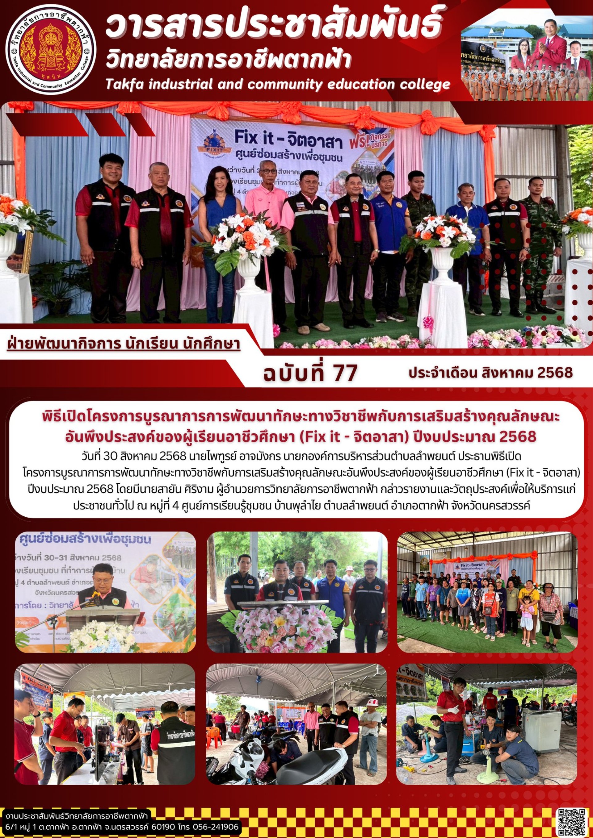 วารสารตากฟ้า ประจำเดือน สิงหาคม 2568 ฉบับที่ 77 พิธีเปิดโครงการบูรณาการการพัฒนาทักษะทางวิชาชีพกับการเสริมสร้างคุณลักษณะอันพึงประสงค์ของผู้เรียนอาชีวศึกษา (Fix it - จิตอาสา) ปีงบประมาณ 2568