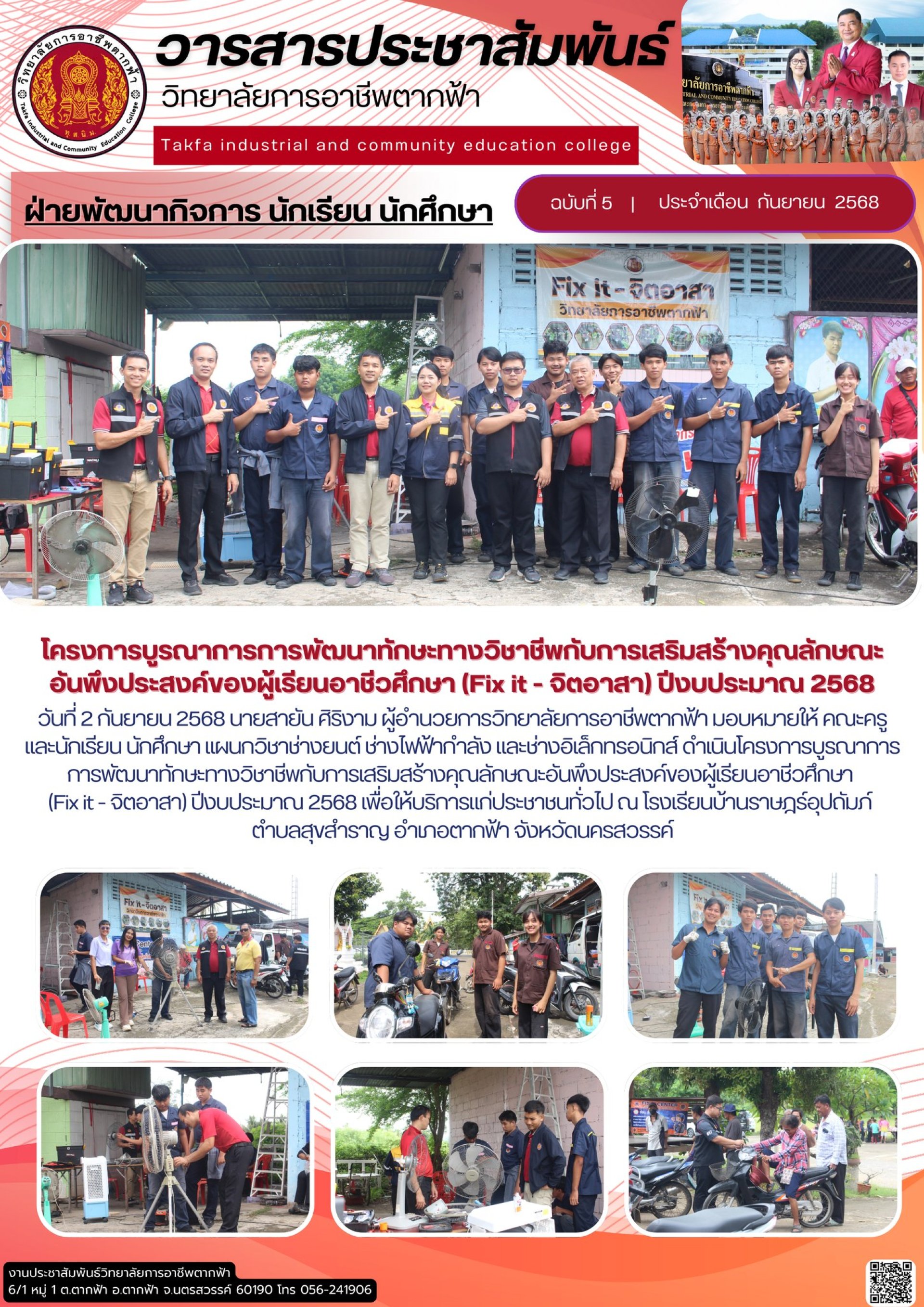 วารสารตากฟ้า ประจำเดือน กันยายน 2568 ฉบับที่ 5 โครงการบูรณาการการพัฒนาทักษะทางวิชาชีพกับการเสริมสร้างคุณลักษณะอันพึงประสงค์ของผู้เรียนอาชีวศึกษา (Fix it - จิตอาสา) ปีงบประมาณ 2568