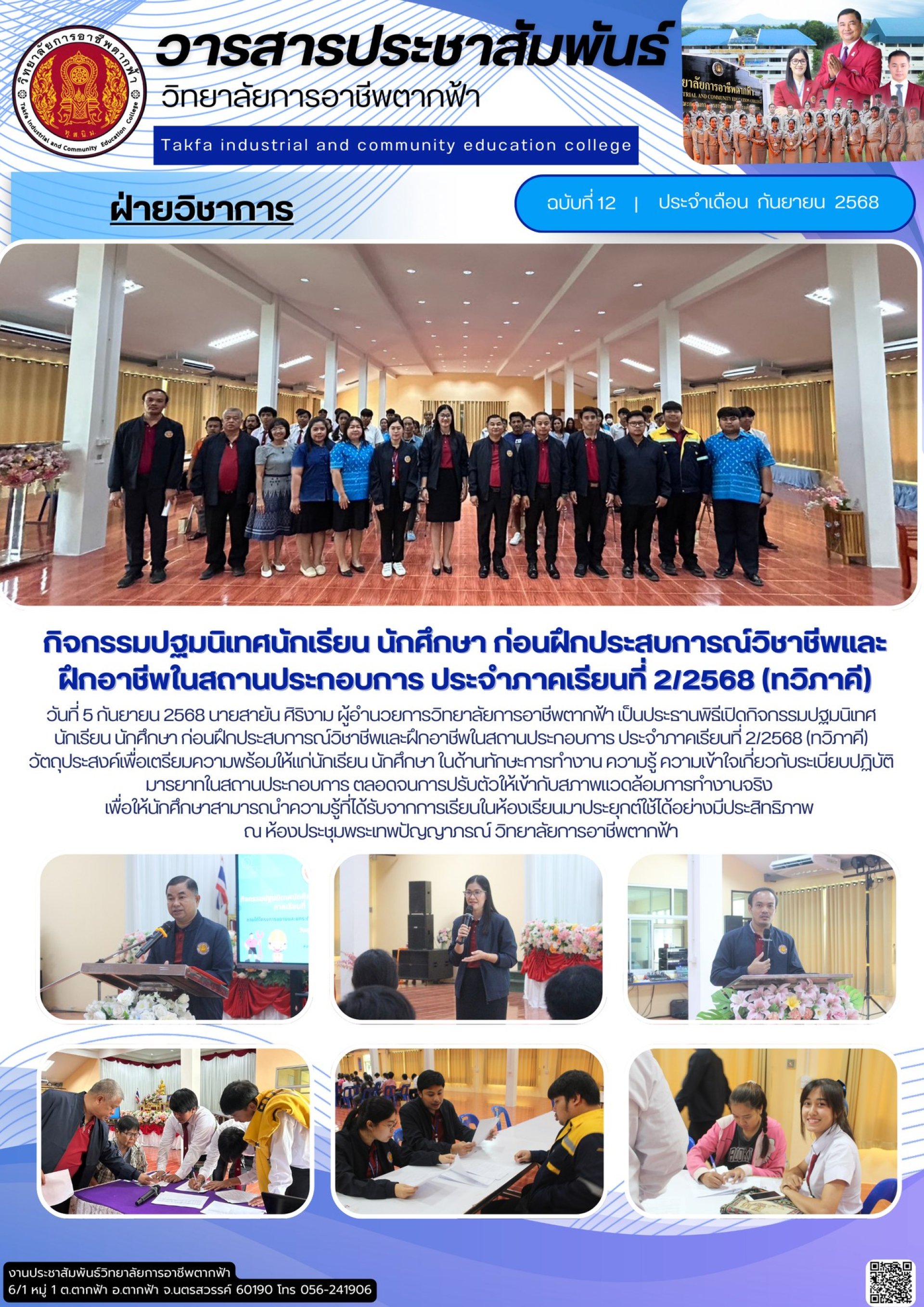 วารสารตากฟ้า ประจำเดือน กันยายน 2568 ฉบับที่ 12 กิจกรรมปฐมนิเทศนักเรียน นักศึกษา ก่อนฝึกประสบการณ์วิชาชีพและฝึกอาชีพในสถานประกอบการ ประจำภาคเรียนที่ 2/2568 (ทวิภาคี)