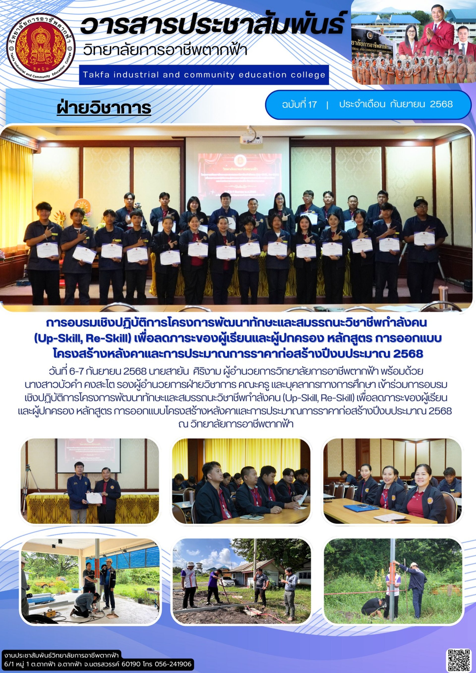 วารสารตากฟ้า ประจำเดือน กันยายน 2568 ฉบับที่ 17 การอบรมเชิงปฏิบัติการโครงการพัฒนาทักษะและสมรรถนะวิชาชีพกำลังคน (Up-Skill, Re-Skill) เพื่อลดภาระของผู้เรียนและผู้ปกครอง หลักสูตร การออกแบบโครงสร้างหลังคาและการประมาณการราคาก่อสร้างปีงบประมาณ 2568 วันที่ 6-7 ก