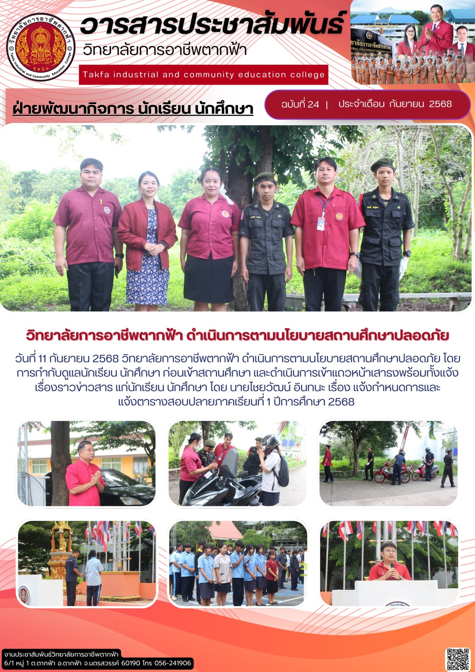 วารสารตากฟ้า ประจำเดือน กันยายน 2568 ฉบับที่ 24 วิทยาลัยการอาชีพตากฟ้า ดำเนินการตามนโยบายสถานศึกษาปลอดภัย