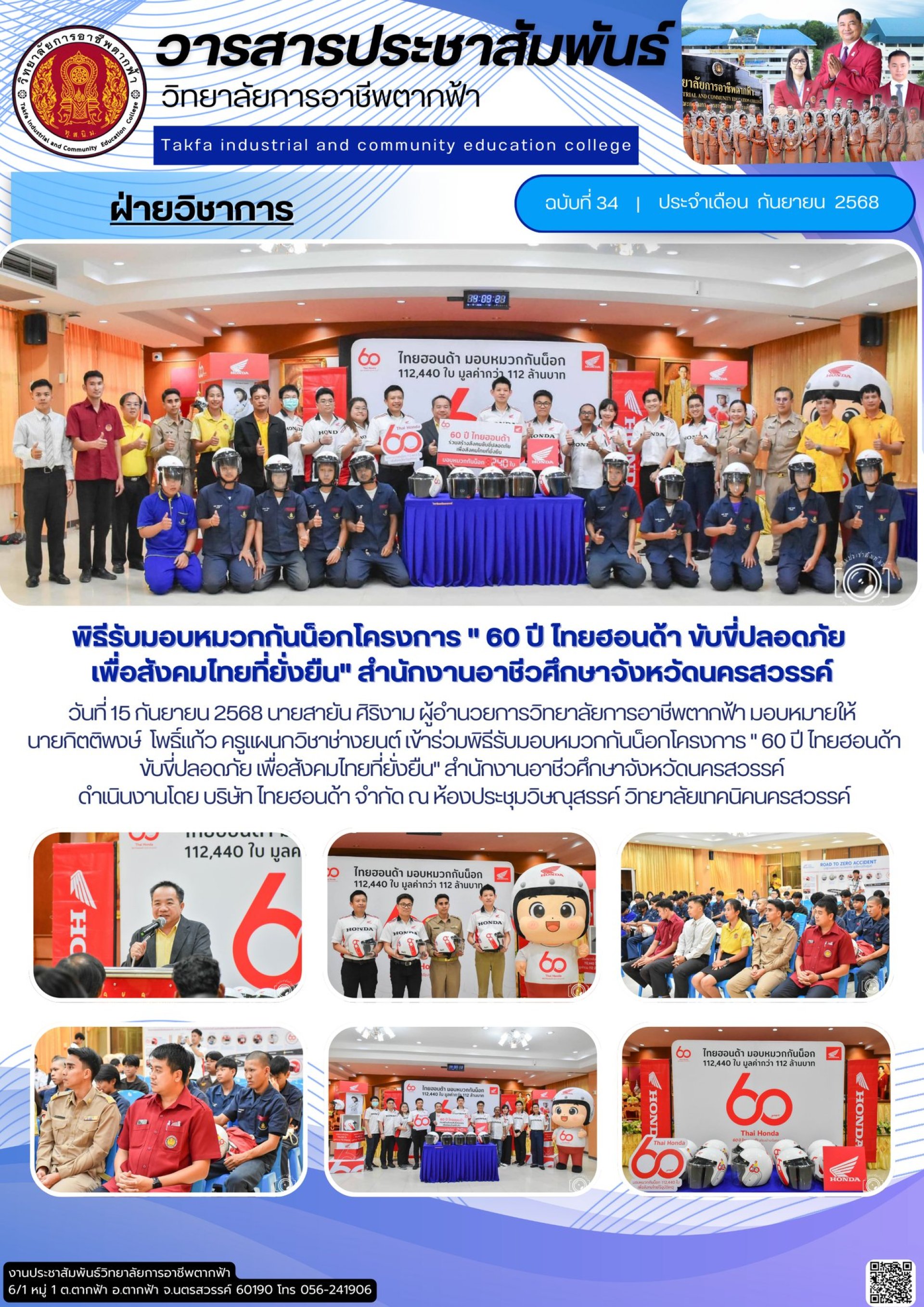 วารสารตากฟ้า ประจำเดือน กันยายน 2568 ฉบับที่ 34 พิธีรับมอบหมวกกันน็อกโครงการ " 60 ปี ไทยฮอนด้า ขับขี่ปลอดภัย เพื่อสังคมไทยที่ยั่งยืน" สำนักงานอาชีวศึกษาจังหวัดนครสวรรค์