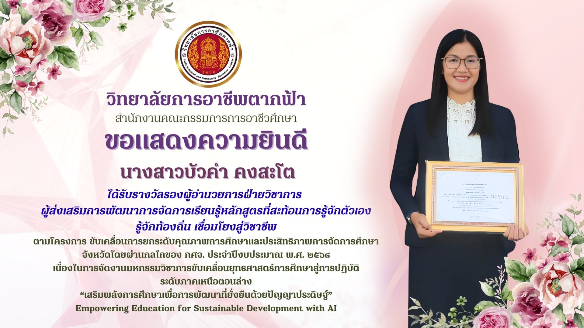 ขอแสดงความยินดี กับ นางสาวบัวคำ คงสะโต รองผู้อำนวยการฝ่ายวิชาการ ได้รับรางวัล ผู้ส่งเสริมการพัฒนาการจัดการเรียนรู้หลักสูตร การจัดการเรียนรู้หลักสูตรที่สะท้อน รู้จักตัวเอง รู้จักท้องถิ่น เชื่อมโยงสู่วิชาชีพ ภายใต้โครงการขับเคลื่อนการยกระดับคุณภาพการศึกษาแล