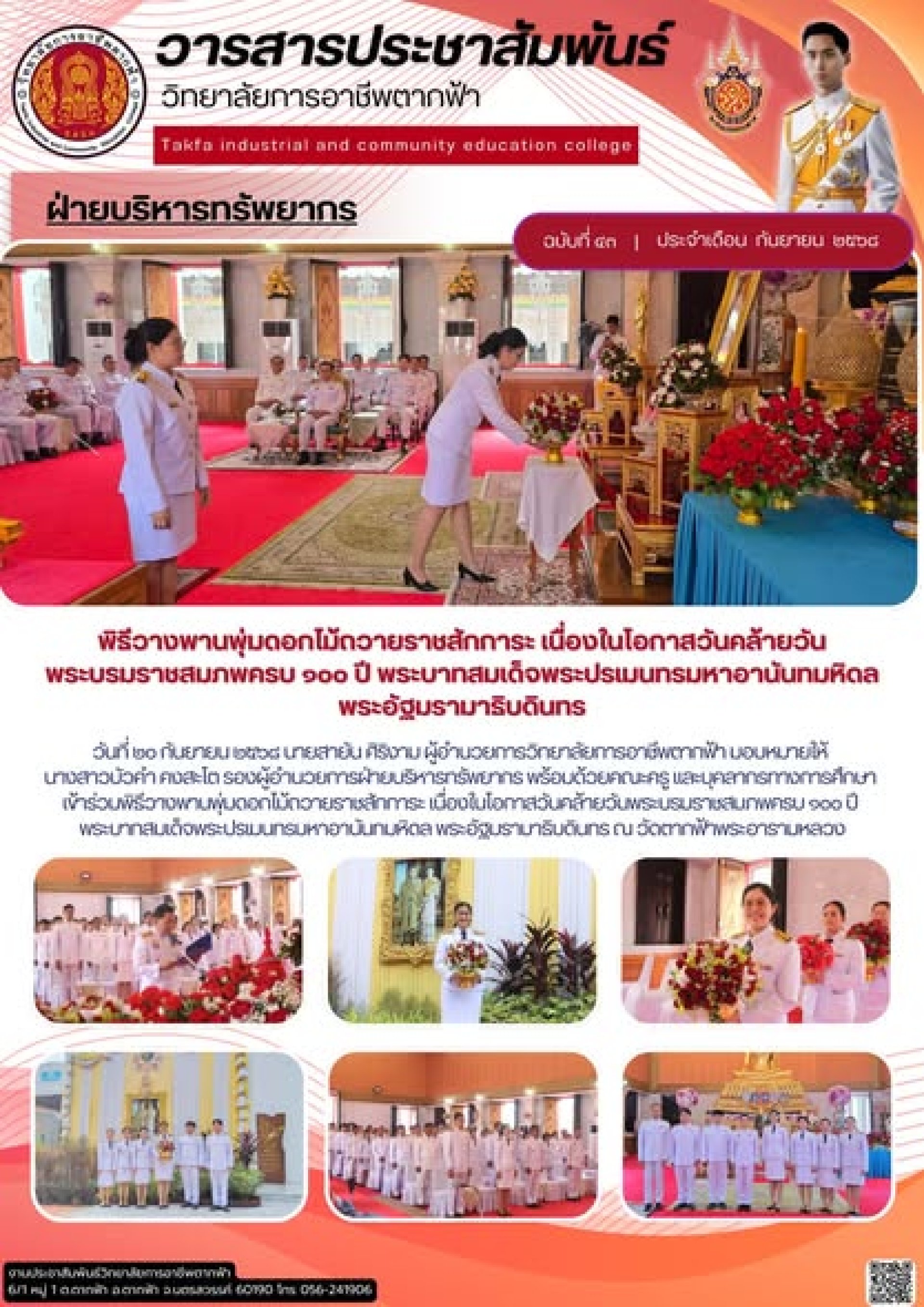 วันที่ ๒๐ กันยายน ๒๕๖๘ นายสายัน ศิริงาม ผู้อำนวยการวิทยาลัยการอาชีพตากฟ้า มอบหมายให้ นางสาวบัวคำ คงสะโต รองผู้อำนวยการฝ่ายบริหารทรัพยากร พร้อมด้วยคณะครู และบุคลากรทางการศึกษา เข้าร่วมพิธีวางพานพุ่มดอกไม้ถวายราชสักการะ เนื่องในโอกาสวันคล้ายวันพระบรมราชสมภพครบ ๑๐๐ ปี พระบาทสมเด็จพระปรเมนทรมหาอานันทมหิดล พระอัฐมรามาธิบดินทร ณ วัดตากฟ้าพระอารามหลวง