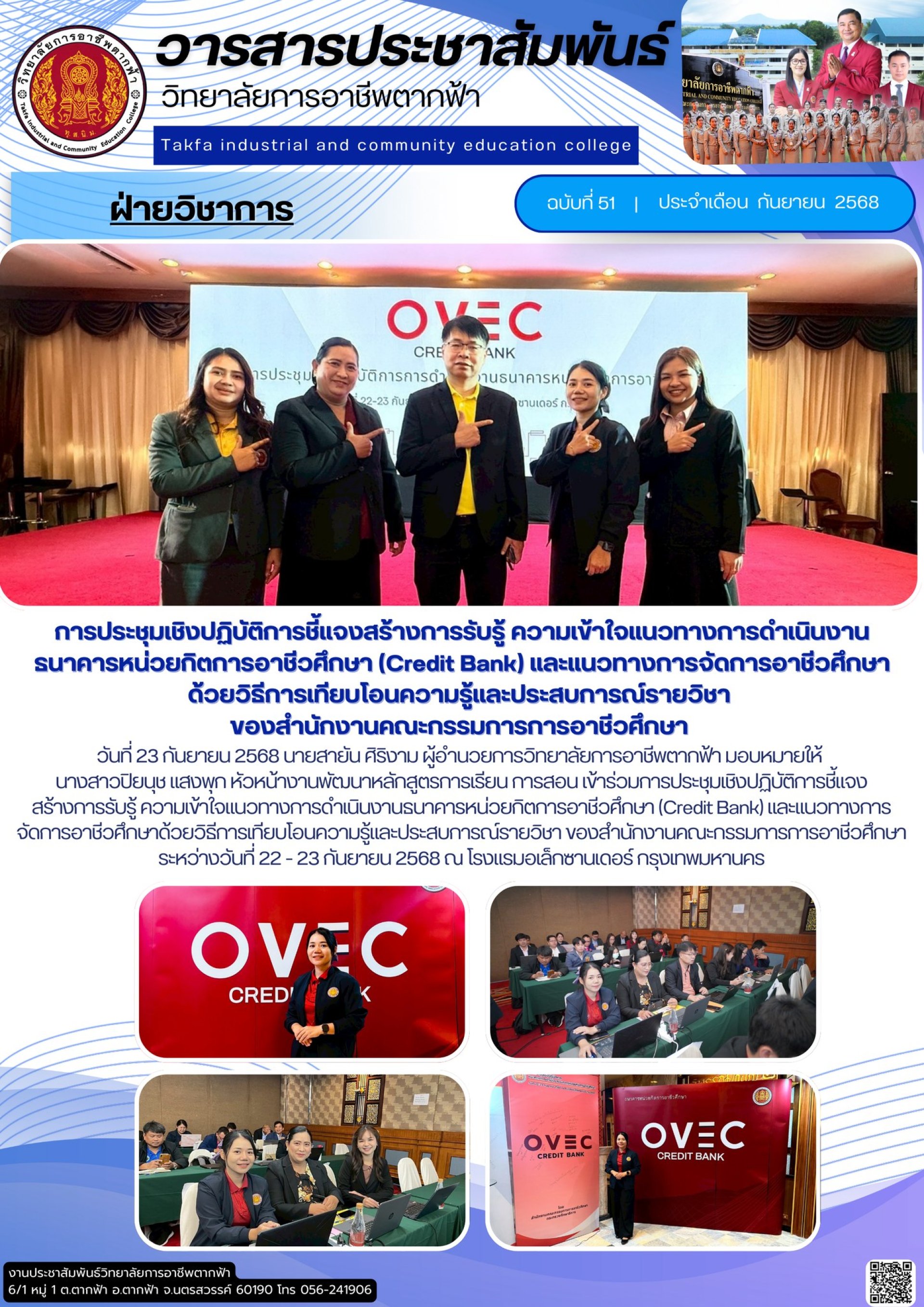วารสารตากฟ้า ประจำเดือน กันยายน 2568 ฉบับที่ 51 การประชุมเชิงปฏิบัติการชี้แจงสร้างการรับรู้ ความเข้าใจแนวทางการดำเนินงานธนาคารหน่วยกิตการอาชีวศึกษา (Credit Bank) และแนวทางการจัดการอาชีวศึกษาด้วยวิธีการเทียบโอนความรู้และประสบการณ์รายวิชา ของสำนักงานคณะกรรม