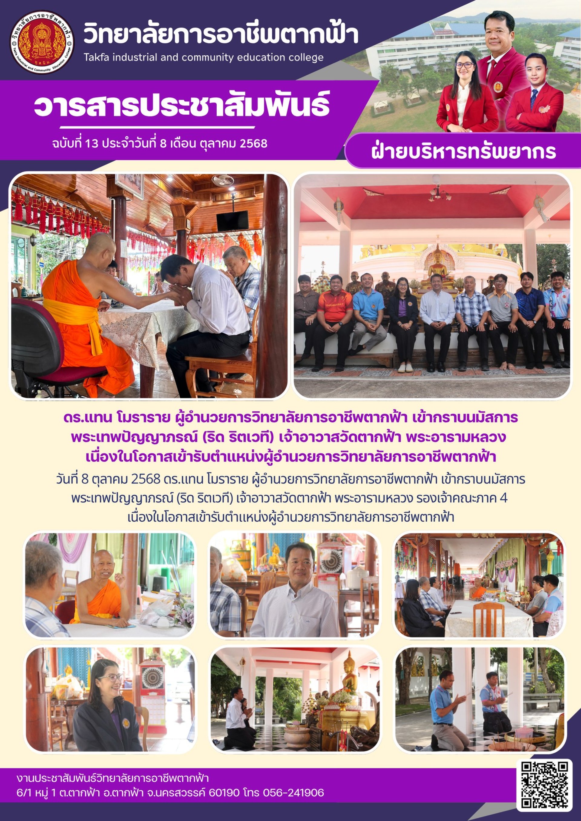 วารสารตากฟ้า ประจำเดือน ตุลาคม 2568 ฉบับที่ 13 ดร.แทน โมราราย ผู้อำนวยการวิทยาลัยการอาชีพตากฟ้า เข้ากราบนมัสการพระเทพปัญญาภรณ์ (ริด ริตเวที) เจ้าอาวาสวัดตากฟ้า พระอารามหลวง เนื่องในโอกาสเข้ารับตำแหน่งผู้อำนวยการวิทยาลัยการอาชีพตากฟ้า