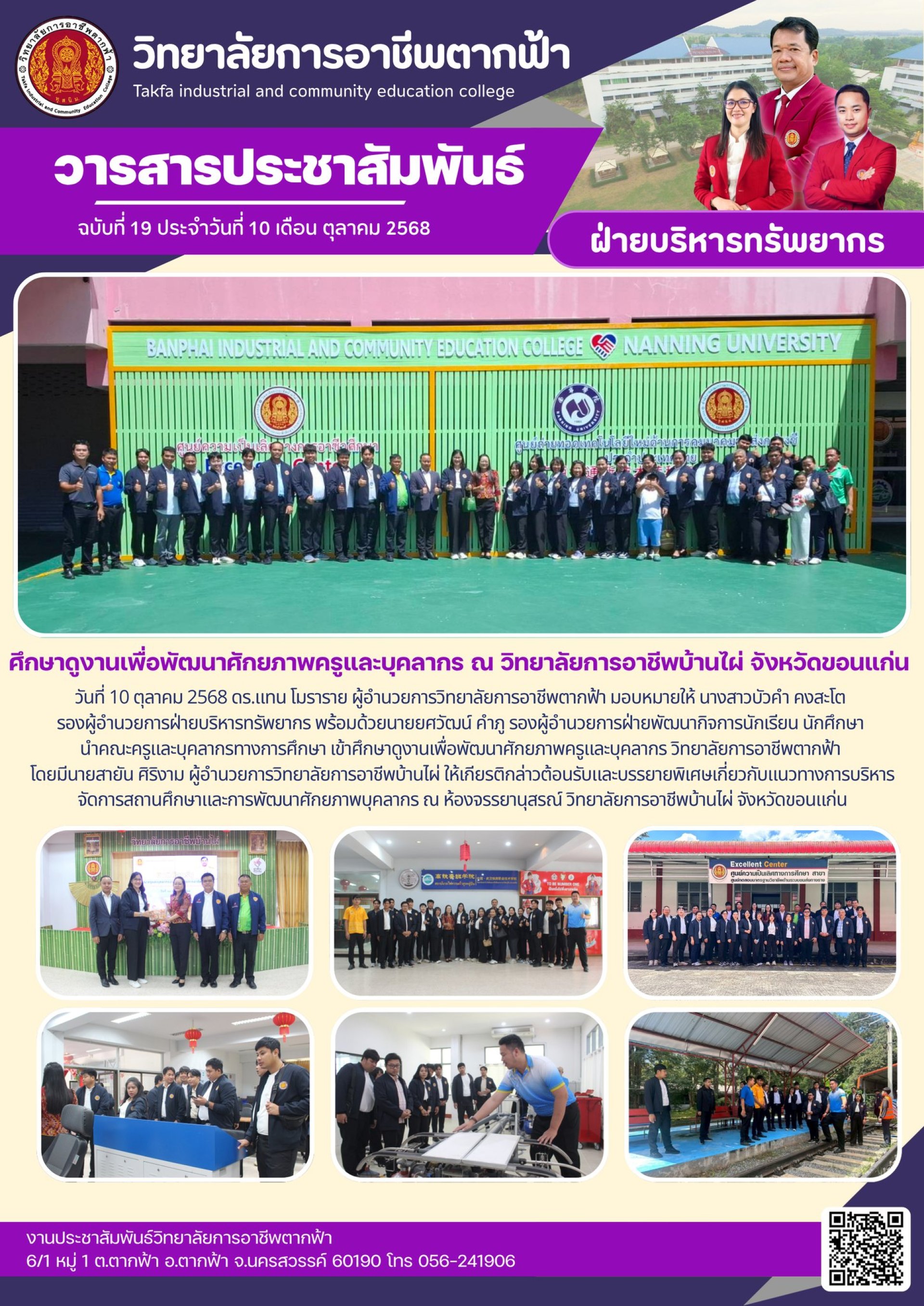 วารสารตากฟ้า ประจำเดือน ตุลาคม 2568 ฉบับที่ 19 ศึกษาดูงานเพื่อพัฒนาศักยภาพครูและบุคลากร ณ วิทยาลัยการอาชีพบ้านไผ่ จังหวัดขอนแก่น