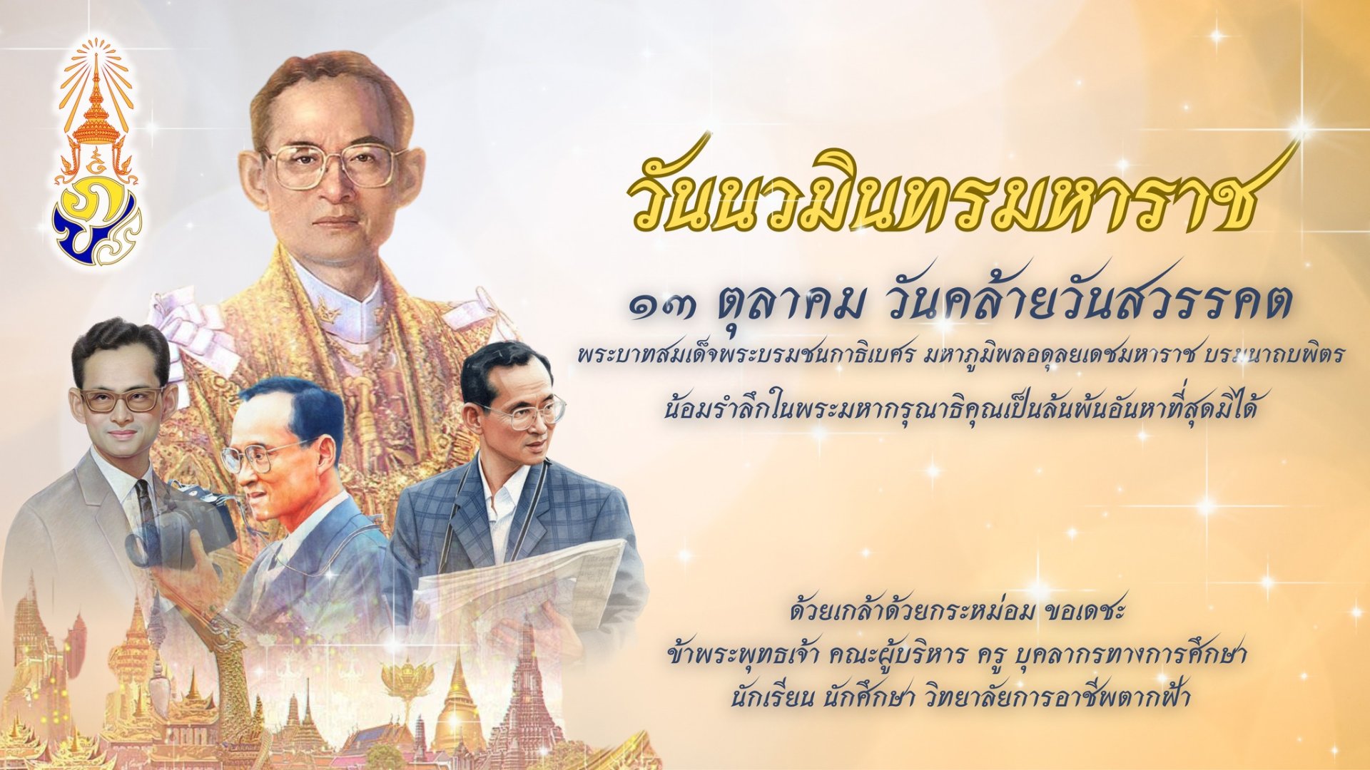 วันนวมินทรมหาราช ๑๓ ตุลาคม เนื่องในวันคล้ายวันสวรรคต พระบาทสมเด็จพระบรมชนกาธิเบศร มหาภูมิพลอดุลยเดชมหาราช บรมนาถบพิตร น้อมสำนึกในพระมหากรุณาธิคุณเป็นล้นพ้นอันหาที่สุดมิได้ ด้วยเกล้าด้วยกระหม่อม ขอเดชะ ข้าพระพุทธเจ้า คณะผู้บริหาร ครู บุคลากรทางการศึกษา นัก