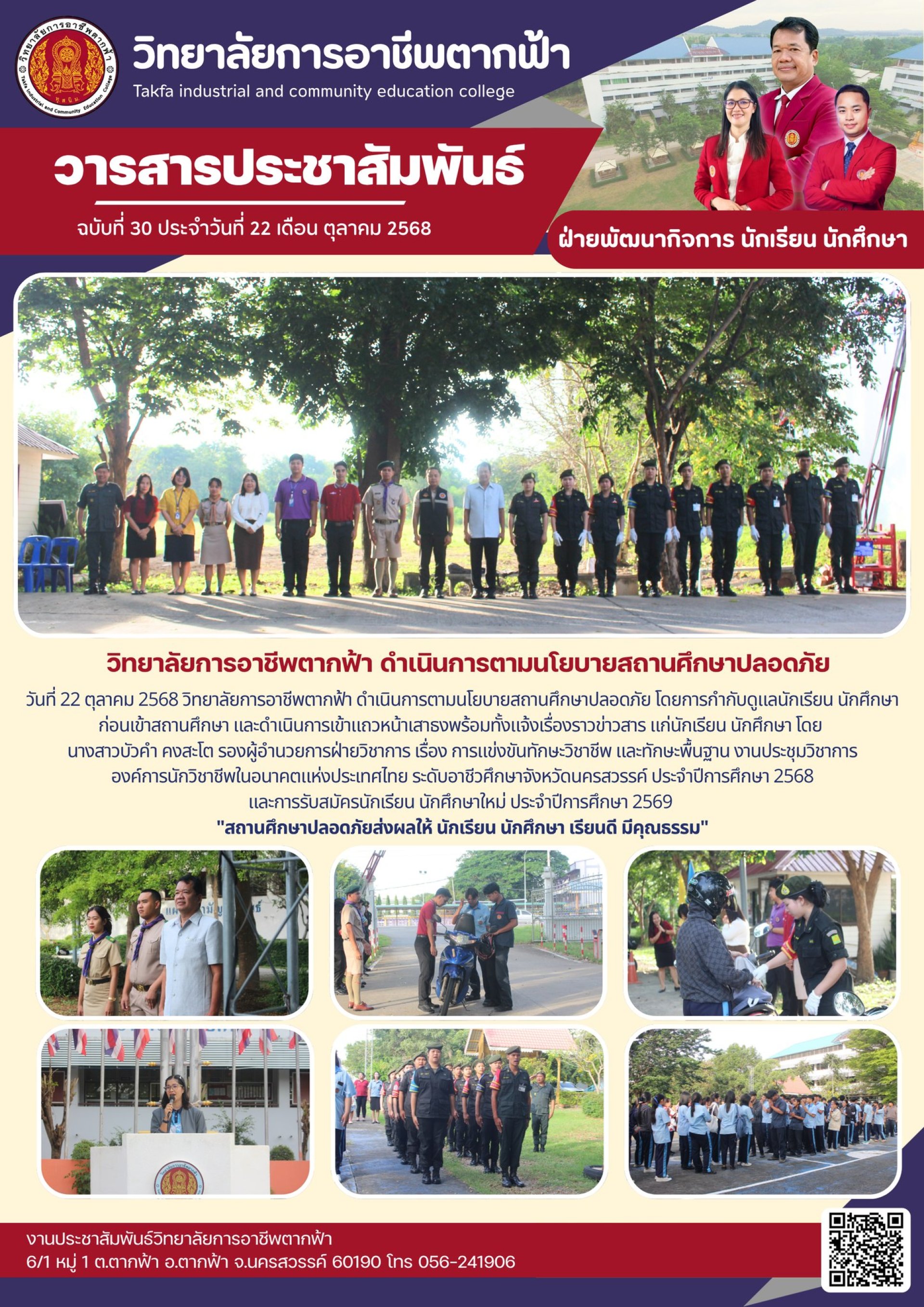 วารสารตากฟ้า ประจำเดือน ตุลาคม 2568 ฉบับที่ 30 วิทยาลัยการอาชีพตากฟ้า ดำเนินการตามนโยบายสถานศึกษาปลอดภัย