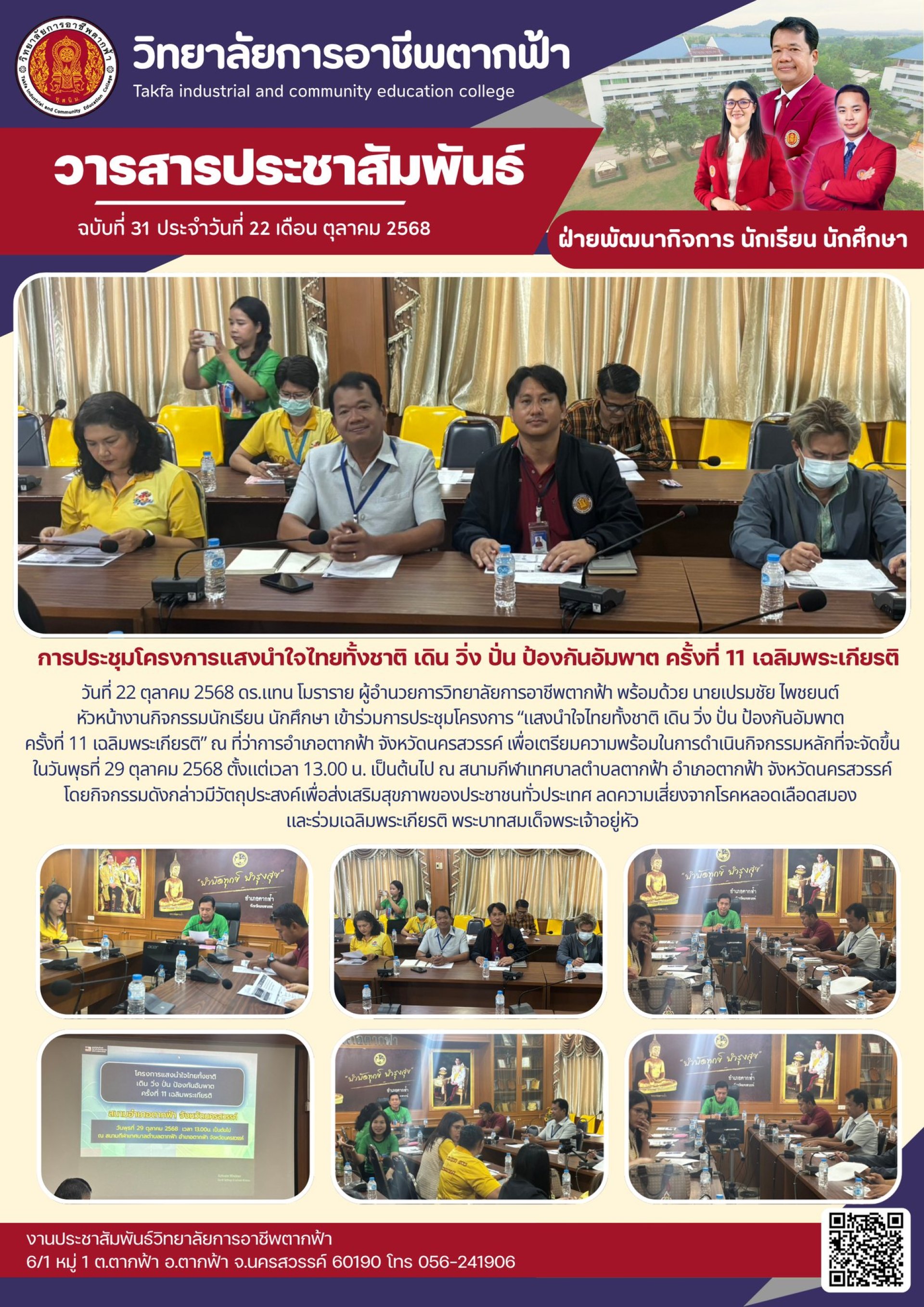วันที่ 22 ตุลาคม 2568 ดร.แทน โมราราย ผู้อำนวยการวิทยาลัยการอาชีพตากฟ้า พร้อมด้วย นายเปรมชัย ไพชยนต์ หัวหน้างานกิจกรรมนักเรียน นักศึกษา เข้าร่วมการประชุมโครงการ แสงนำใจไทยทั้งชาติ เดิน วิ่ง ปั่น ป้องกันอัมพาต ครั้งที่ 11 เฉลิมพระเกียรติ ณ ที่ว่าการอำเภอตากฟ้า จังหวัดนครสวรรค์ เพื่อเตรียมความพร้อมในการดำเนินกิจกรรมหลักที่จะจัดขึ้นในวันพุธที่ 29 ตุลาคม 2568 ตั้งแต่เวลา 13.00 น. เป็นต้นไป ณ สนามกีฬาเทศบาลตำบลตากฟ้า อำเภอตากฟ้า จังหวัดนครสวรรค์ โดยกิจกรรมดังกล่าวมีวัตถุประสงค์เพื่อส่งเสริมสุขภาพของประชาชนทั่วประเทศ ลดความเสี่ยงจากโรคหลอดเลือดสมอง และร่วมเฉลิมพระเกียรติ พระบาทสมเด็จพระเจ้าอยู่หัว