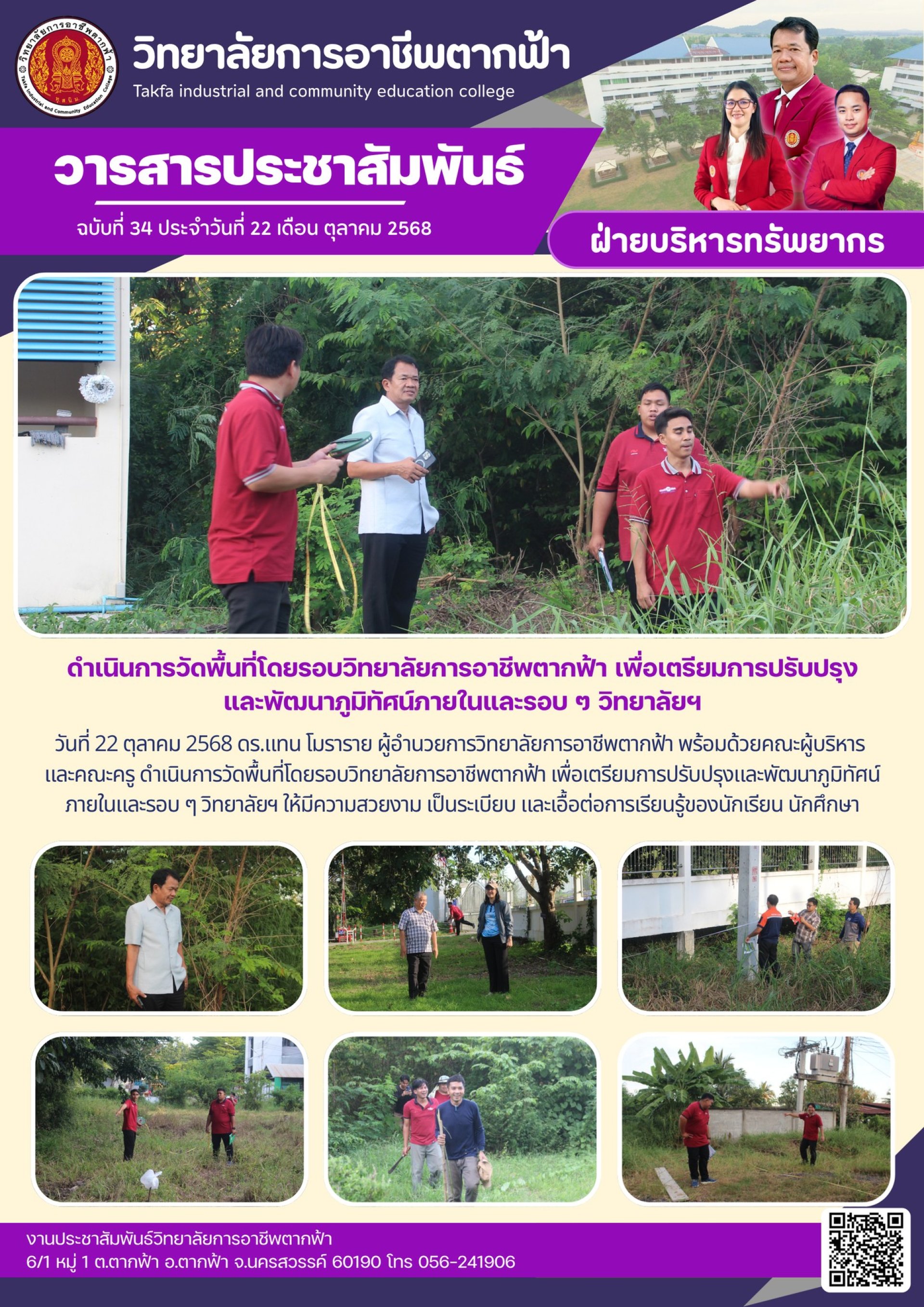 วารสารตากฟ้า ประจำเดือน ตุลาคม 2568 ฉบับที่ 34 ดำเนินการวัดพื้นที่โดยรอบวิทยาลัยการอาชีพตากฟ้า เพื่อเตรียมการปรับปรุงและพัฒนาภูมิทัศน์ภายในและรอบ ๆ วิทยาลัยฯ