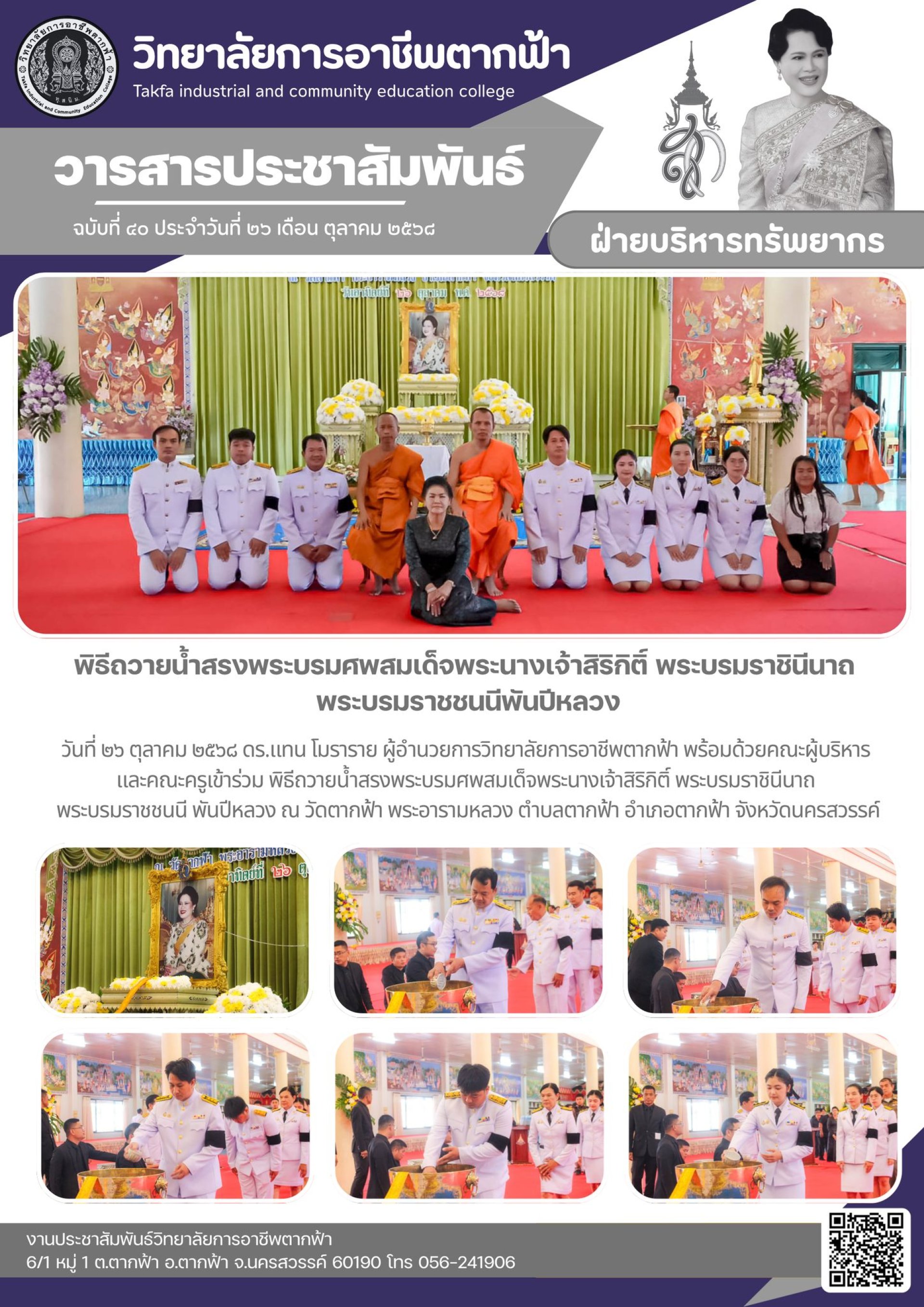 วันที่ ๒๖ ตุลาคม ๒๕๖๘ ดร.แทน โมราราย ผู้อำนวยการวิทยาลัยการอาชีพตากฟ้า พร้อมด้วยคณะผู้บริหาร และคณะครูเข้าร่วม พิธีถวายน้ำสรงพระบรมศพสมเด็จพระนางเจ้าสิริกิติ์ พระบรมราชินีนาถ พระบรมราชชนนี พันปีหลวง ณ วัดตากฟ้า พระอารามหลวง ตำบลตากฟ้า อำเภอตากฟ้า จังหวัดนครสวรรค์
