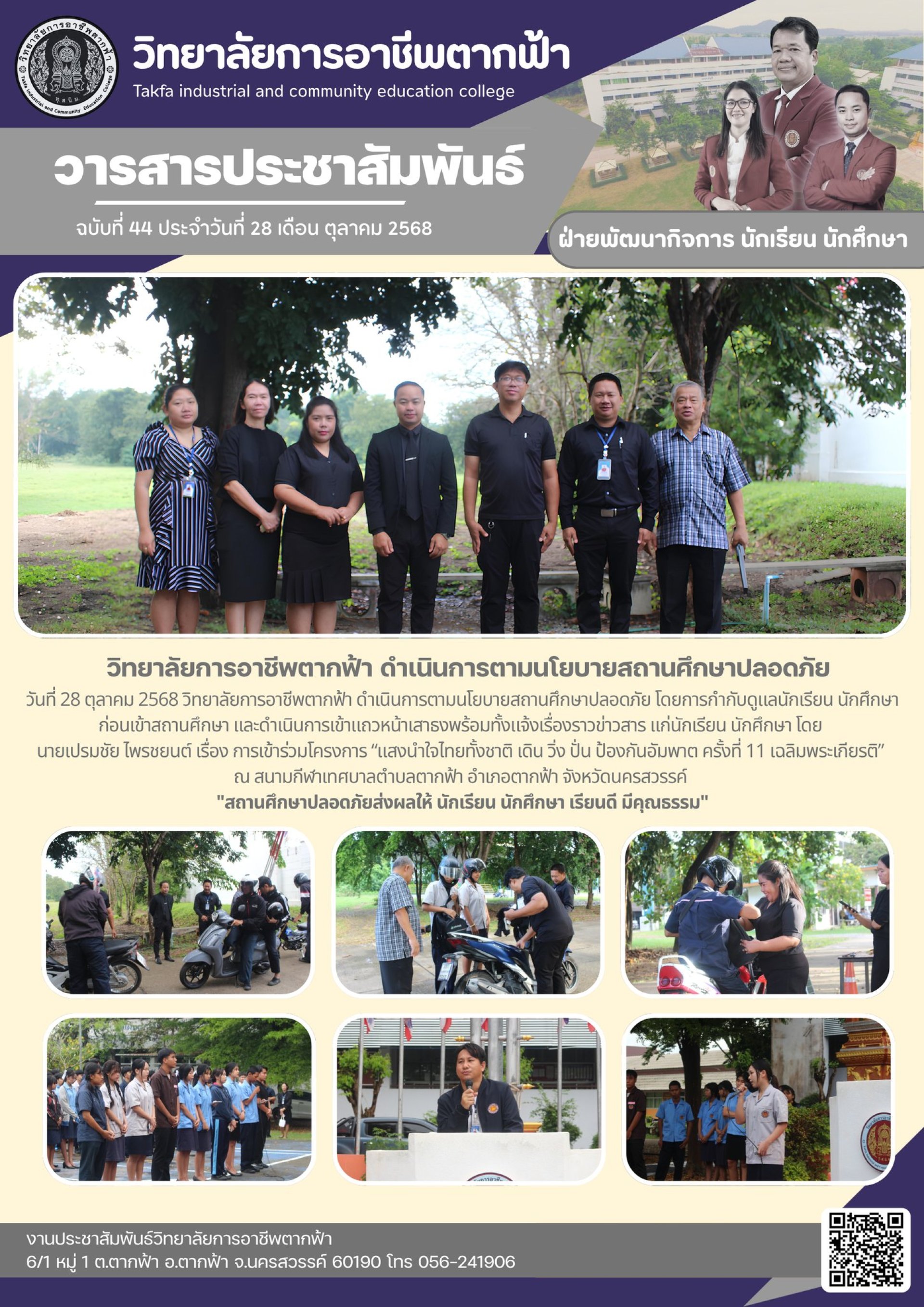 วารสารตากฟ้า ประจำเดือน ตุลาคม 2568 ฉบับที่ 44 วิทยาลัยการอาชีพตากฟ้า ดำเนินการตามนโยบายสถานศึกษาปลอดภัย