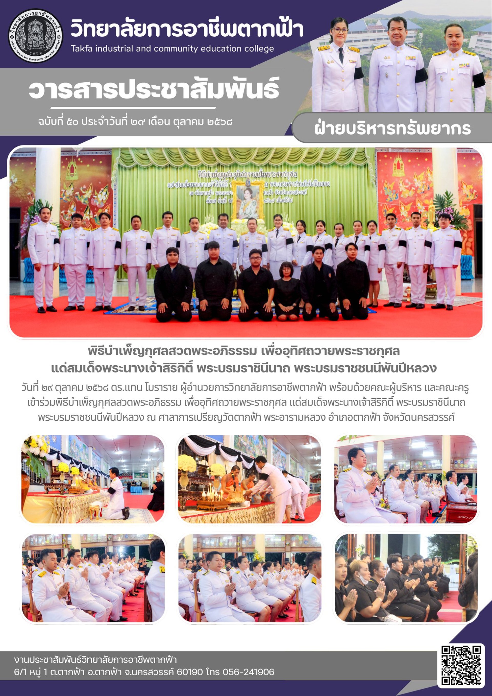 วารสารตากฟ้า ประจำเดือน ตุลาคม ๒๕๖๘ ฉบับที่ ๕๐ พิธีบำเพ็ญกุศลสวดพระอภิธรรม เพื่ออุทิศถวายพระราชกุศล แด่สมเด็จพระนางเจ้าสิริกิติ์ พระบรมราชินีนาถ พระบรมราชชนนีพันปีหลวง