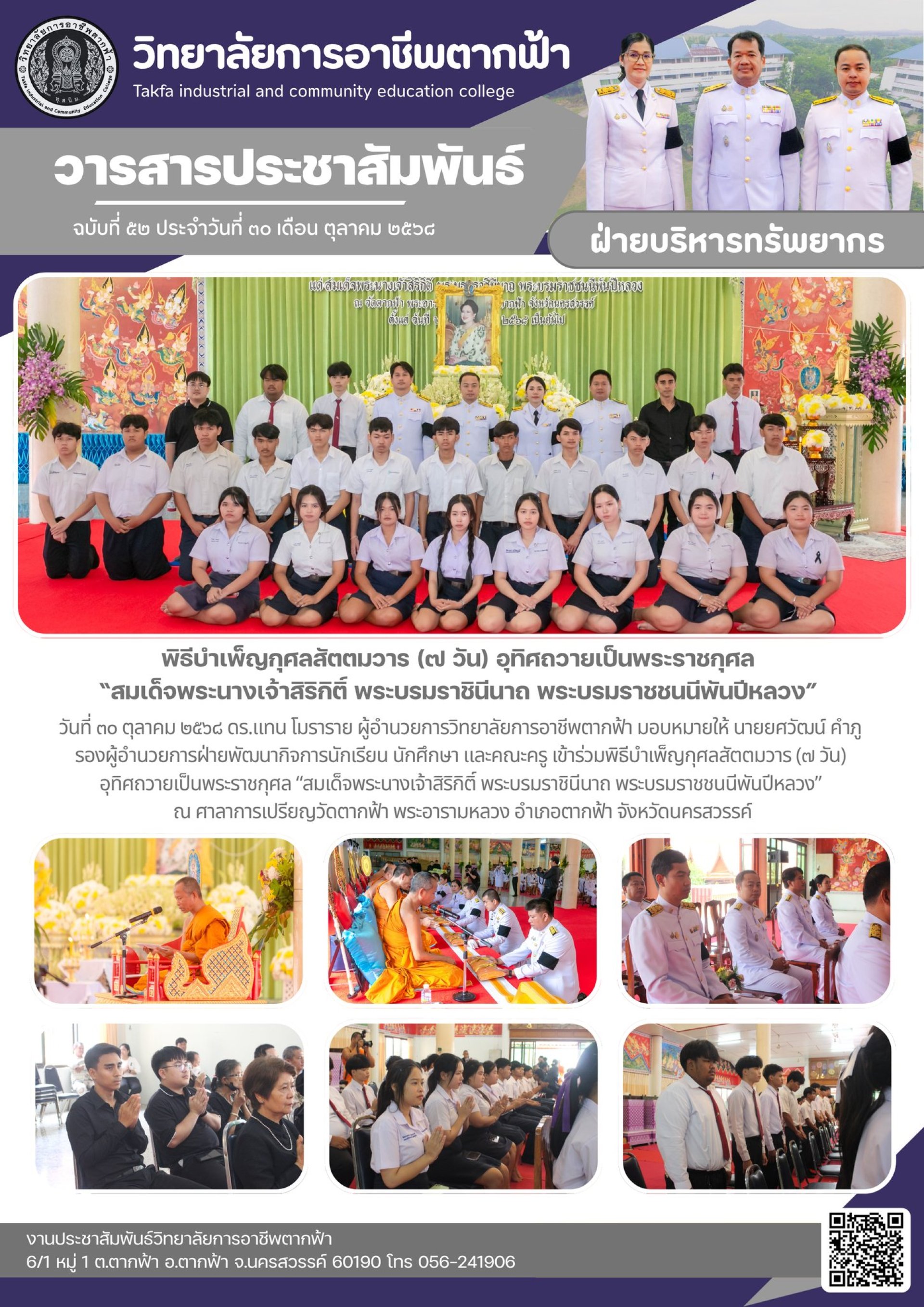 วารสารตากฟ้า ประจำเดือน ตุลาคม ๒๕๖๘ ฉบับที่ ๕๒ พิธีบำเพ็ญกุศลสัตตมวาร (๗ วัน) อุทิศถวายเป็นพระราชกุศล สมเด็จพระนางเจ้าสิริกิติ์ พระบรมราชินีนาถ พระบรมราชชนนีพันปีหลวง