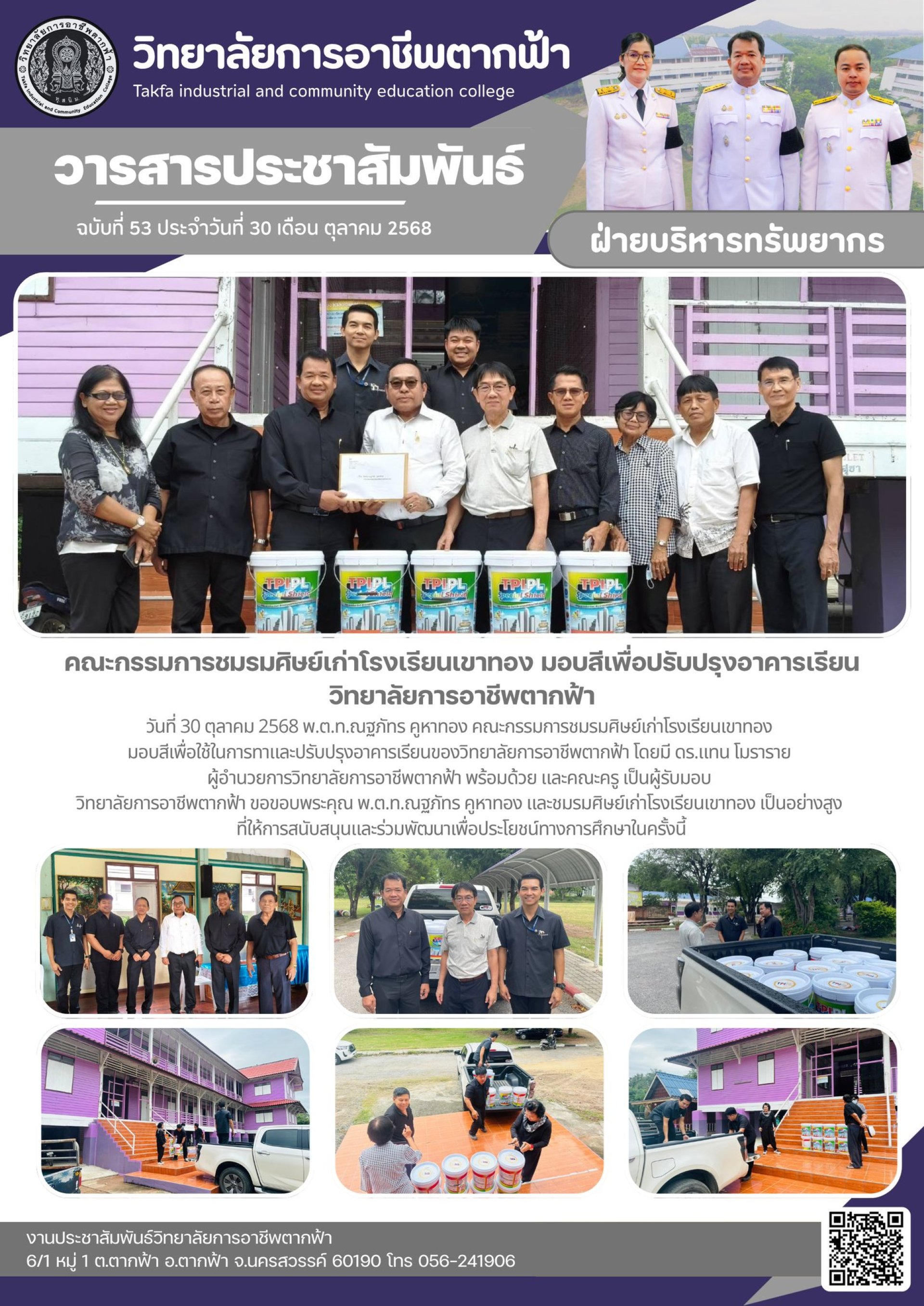 วารสารตากฟ้า ประจำเดือน ตุลาคม 2568 ฉบับที่ 53 คณะกรรมการชมรมศิษย์เก่าโรงเรียนเขาทอง มอบสีเพื่อปรับปรุงอาคารเรียนวิทยาลัยการอาชีพตากฟ้า