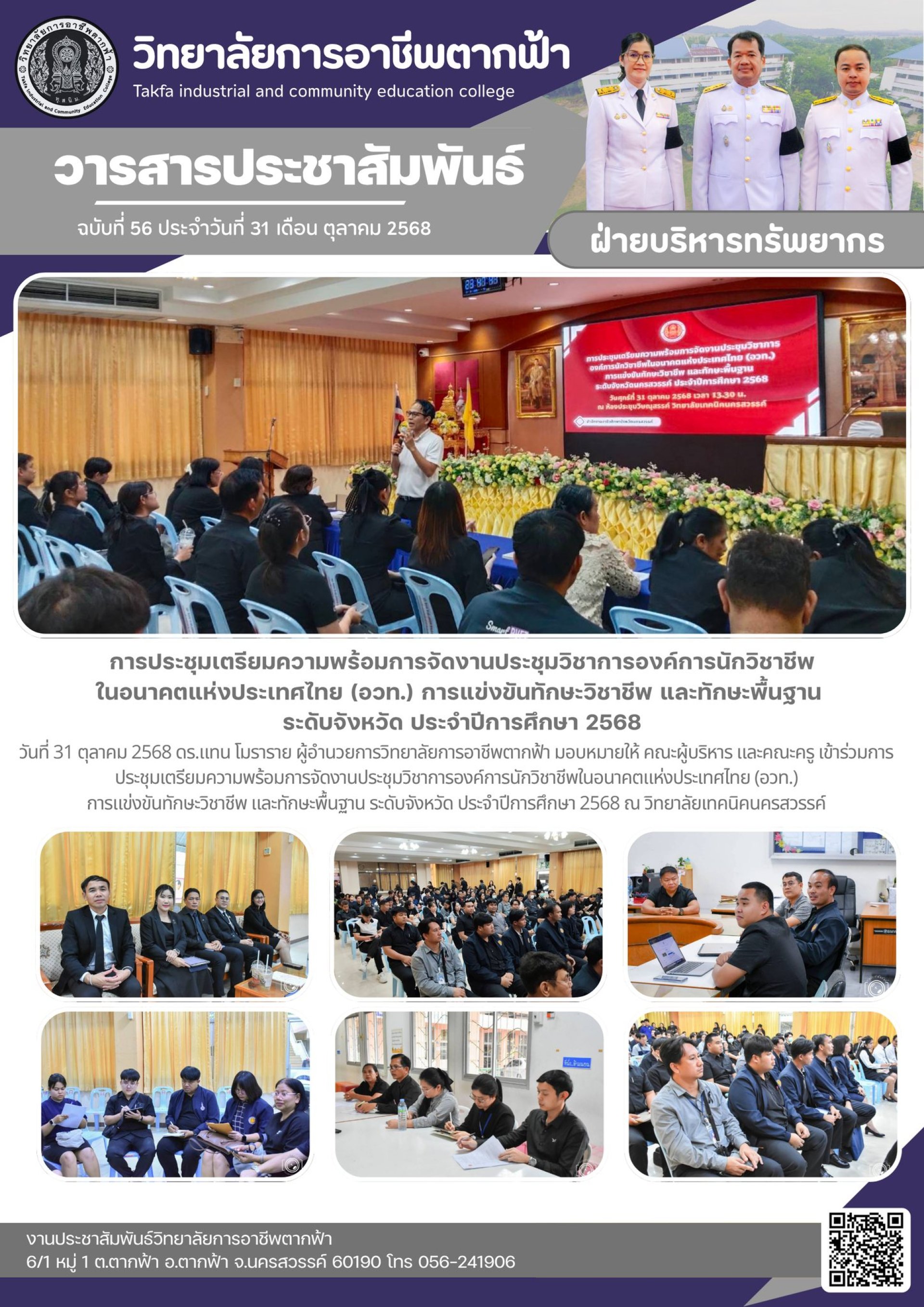 วารสารตากฟ้า ประจำเดือน ตุลาคม 2568 ฉบับที่ 56 การประชุมเตรียมความพร้อมการจัดงานประชุมวิชาการองค์การนักวิชาชีพในอนาคตแห่งประเทศไทย (อวท.) การแข่งขันทักษะวิชาชีพ และทักษะพื้นฐาน ระดับจังหวัด ประจำปีการศึกษา 256