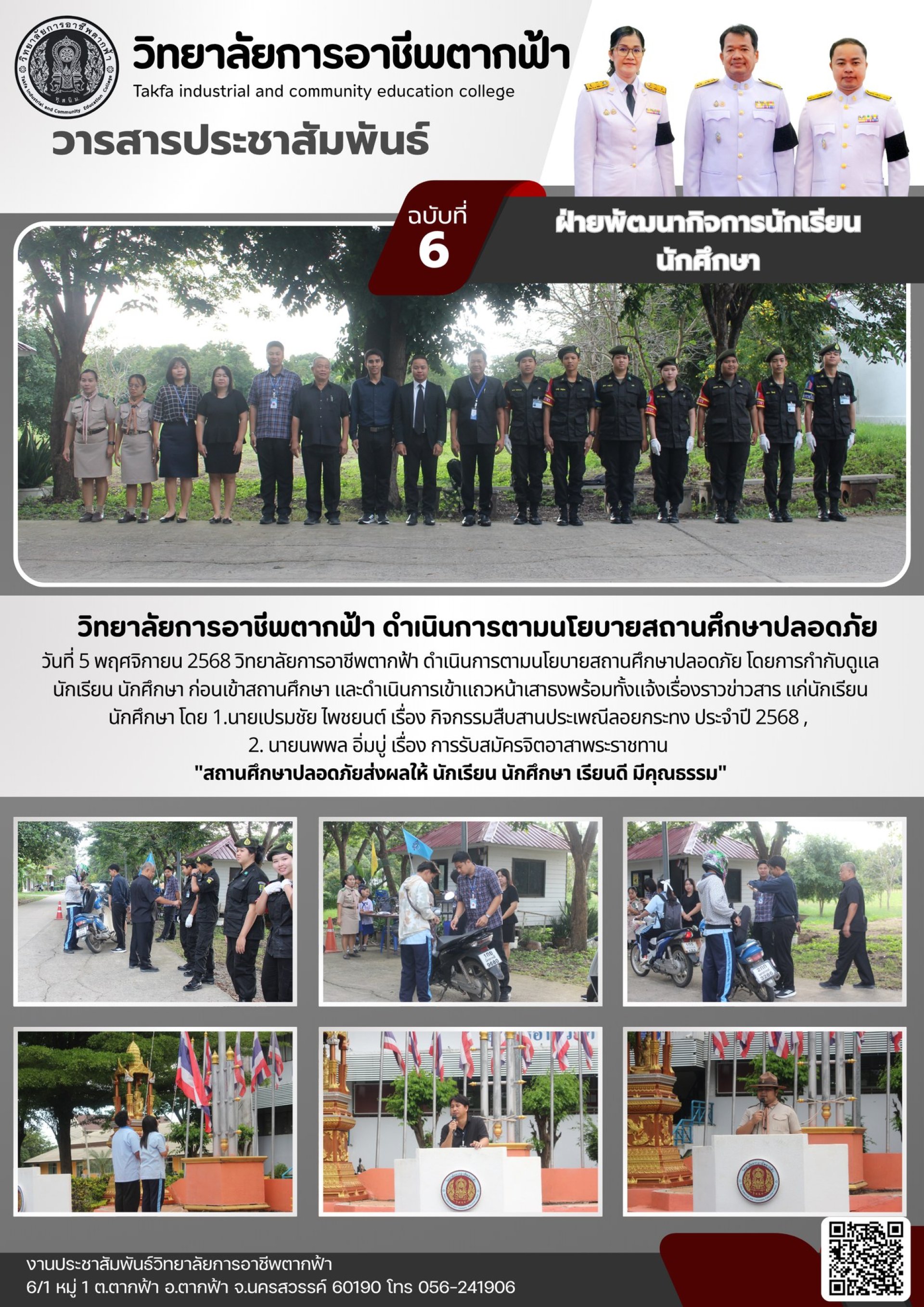 วารสารตากฟ้า ประจำเดือน พฤศจิกายน 2568 ฉบับที่ 6 วิทยาลัยการอาชีพตากฟ้า ดำเนินการตามนโยบายสถานศึกษาปลอดภัย