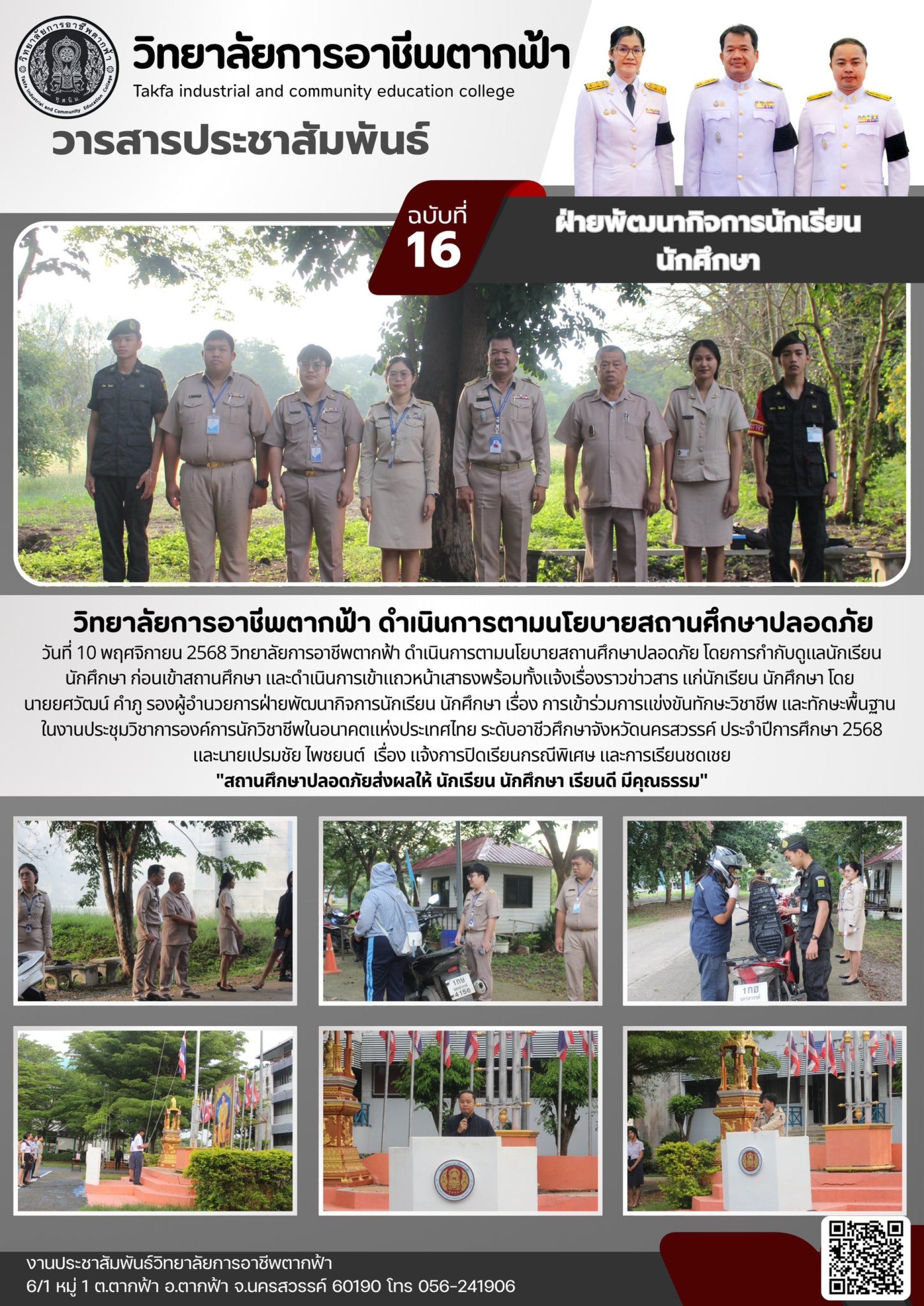 วารสารตากฟ้า ประจำเดือน พฤศจิกายน 2568 ฉบับที่ 16 วิทยาลัยการอาชีพตากฟ้า ดำเนินการตามนโยบายสถานศึกษาปลอดภัย
