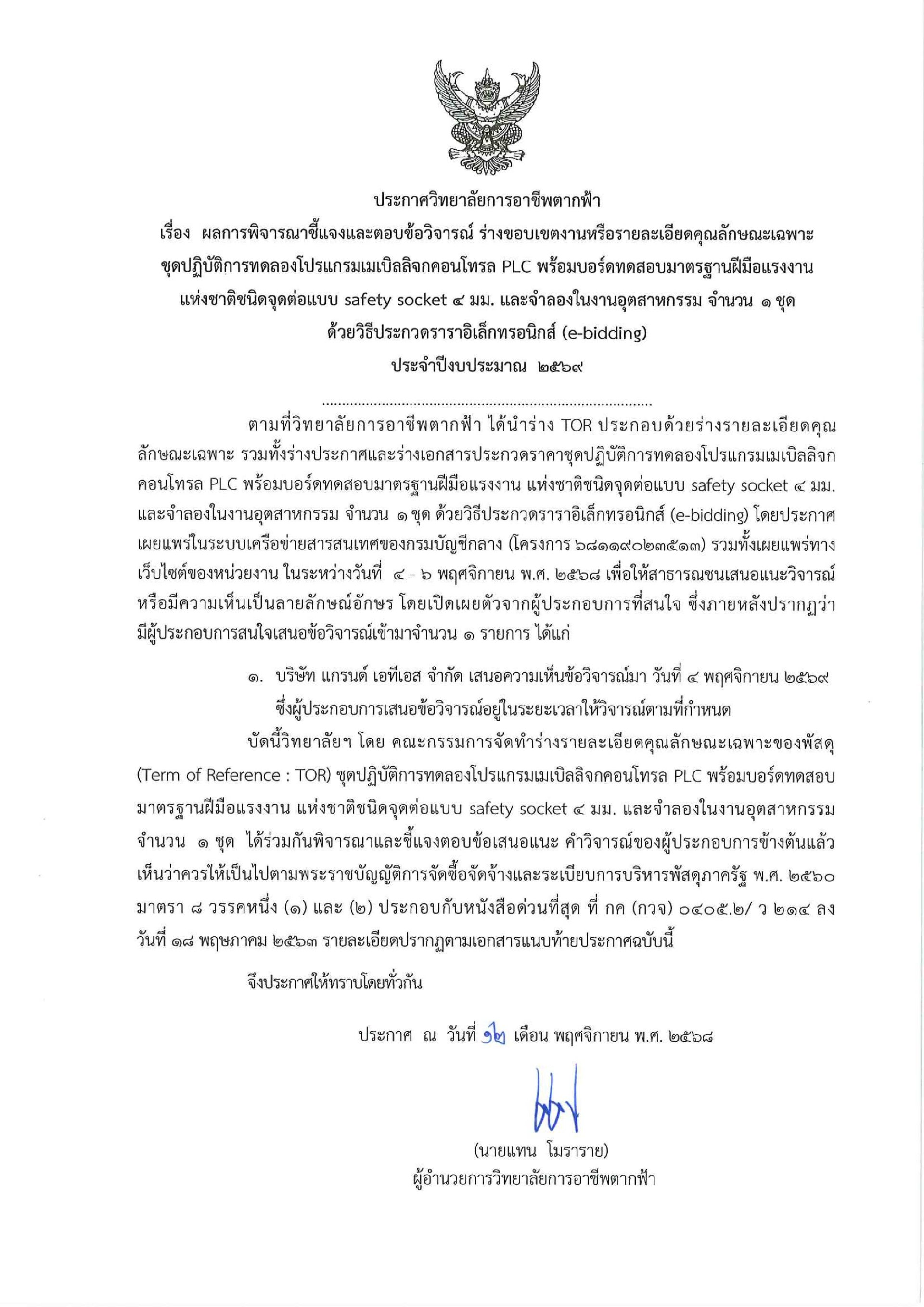 ผลการพิจารณาชี้แจงและตอบข้อวิจารณ์ ร่างขอบเขตงานหรือรายละเอียดคุณลักษณะเฉพาะชุดปฎิบัติการทดลองโปรแกรมเมเบิลลอจิกคอนโทรล PLC พร้อมบอร์ดทดสอบมาตรฐานฝีมือแรงงาน ด้วยวิธีการประกวดราคาอิเล็กทรอนิกส์ e-bidding