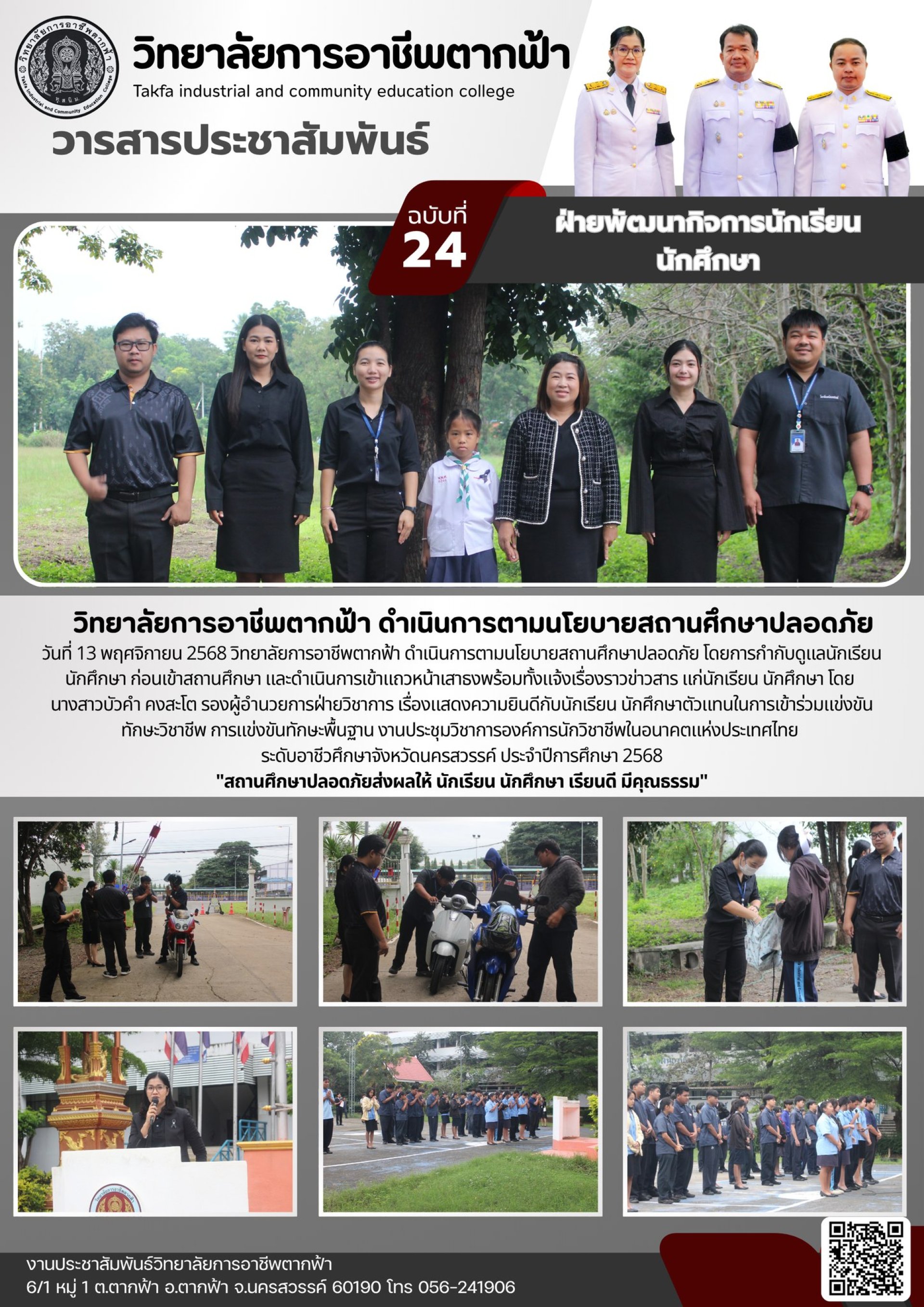 วารสารตากฟ้า ประจำเดือน พฤศจิกายน 2568 ฉบับที่ 24 วิทยาลัยการอาชีพตากฟ้า ดำเนินการตามนโยบายสถานศึกษาปลอดภัย