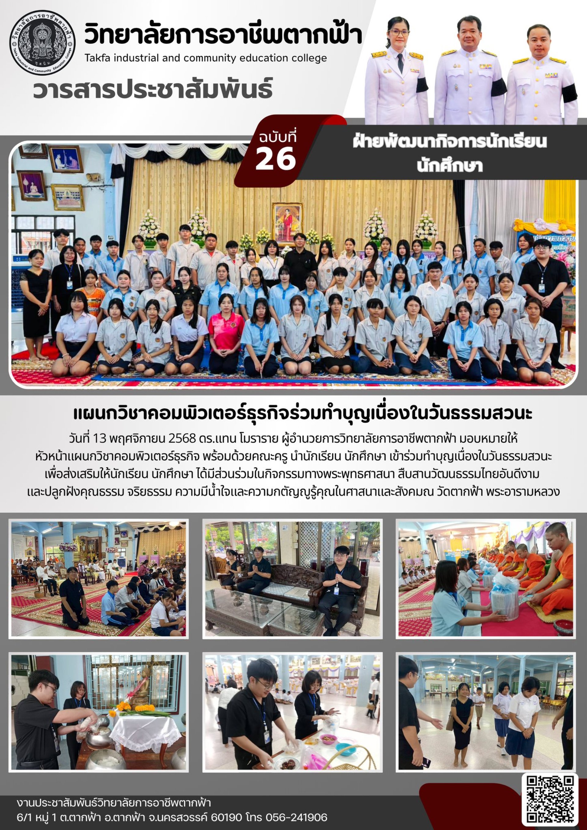 วารสารตากฟ้า ประจำเดือน พฤศจิกายน 2568 ฉบับที่ 26 แผนกวิชาคอมพิวเตอร์ธุรกิจร่วมทำบุญเนื่องในวันธรรมสวนะ