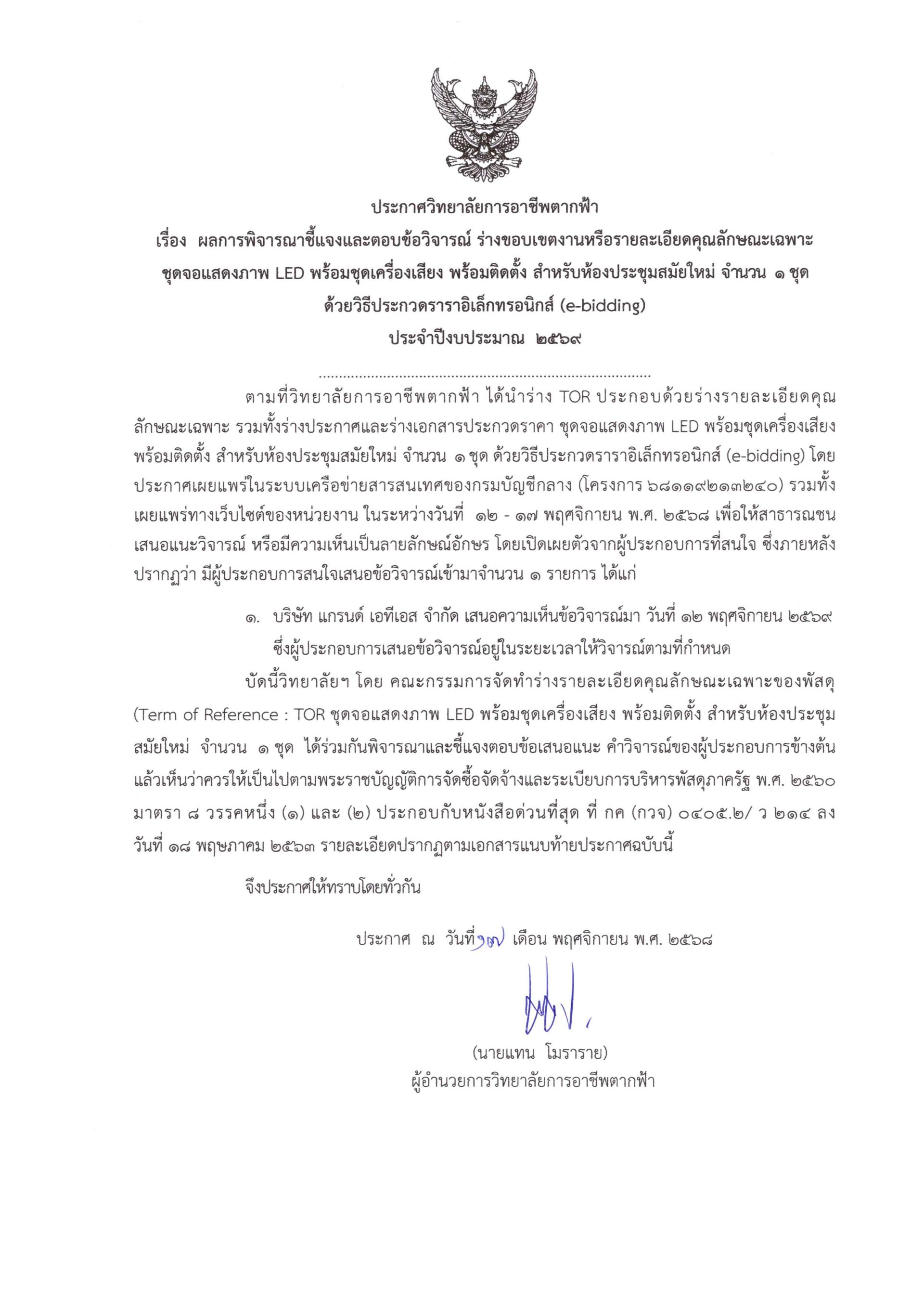 ผลการพิจารณาชี้แจงและตอบข้อวิจารณ์ ร่างขอบเขตงานหรือรายละเอียดคุณลักษณะเฉพาะชุดจอแสดงภาพ LED พร้องชุดเครื่องเสียงพร้อมติดตั้งสำหรับห้องประชุมสมัยใหม่ ด้วยวิธีประกวดราคา e-bidding ประจำปีงบประมาณ 2569