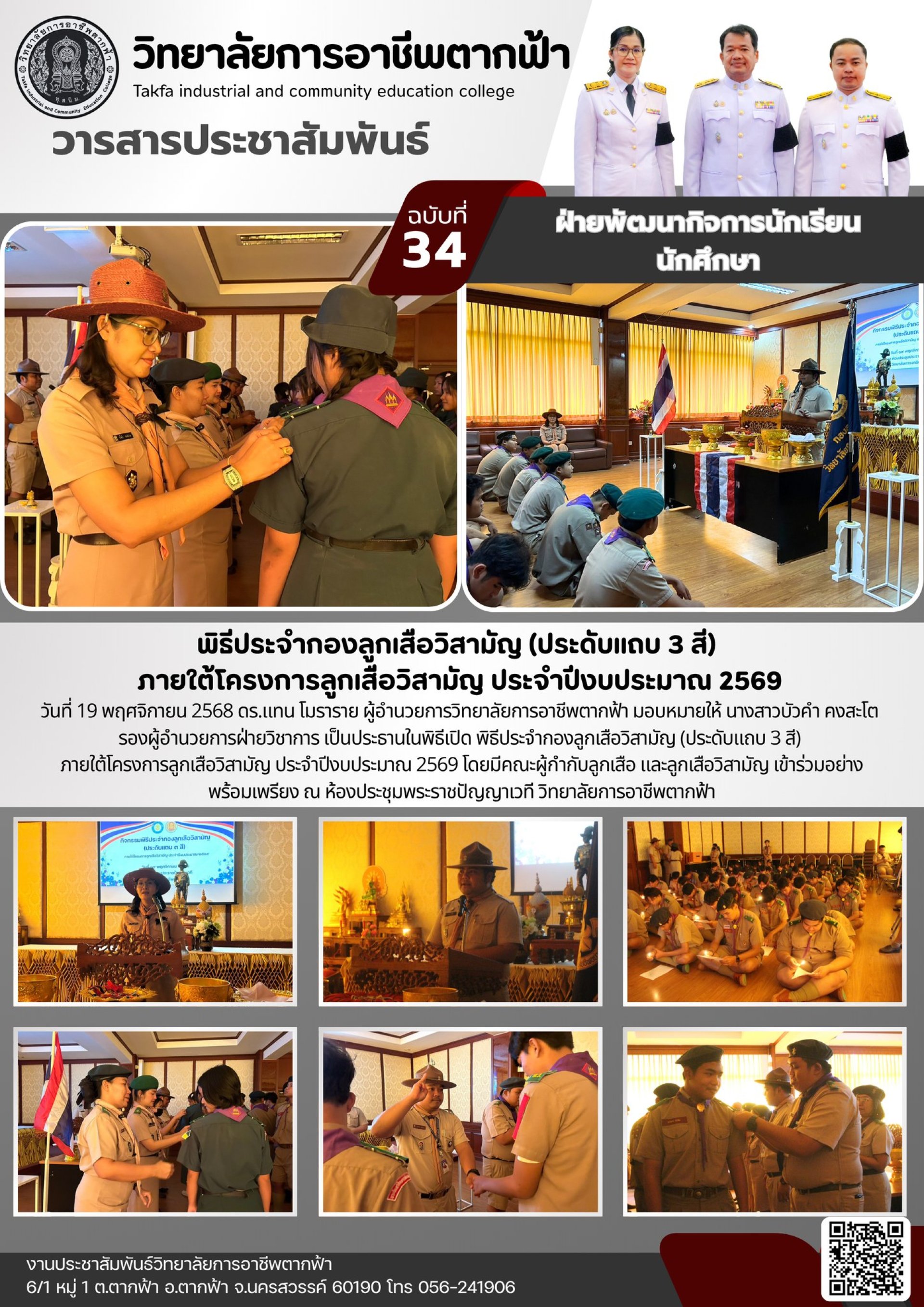 วารสารตากฟ้า ประจำเดือน พฤศจิกายน 2568 ฉบับที่ 34 พิธีประจำกองลูกเสือวิสามัญ (ประดับแถบ 3 สี) ภายใต้โครงการลูกเสือวิสามัญ ประจำปีงบประมาณ 2569