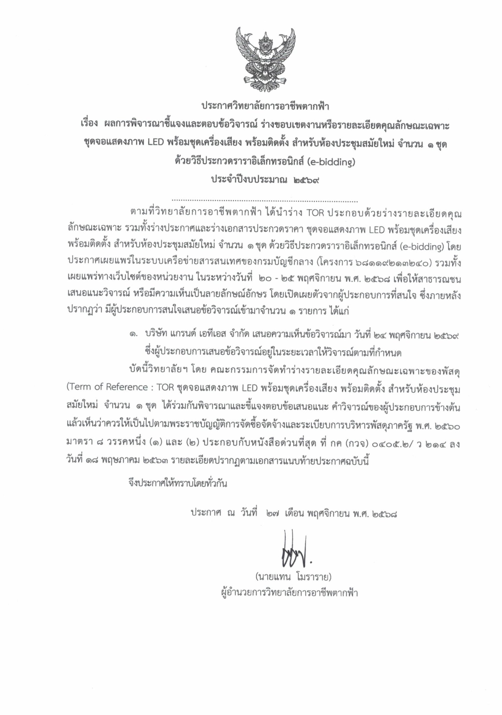 ประกาศผลชี้แจงและตอบข้อวิจารณ์ ร่างขอบเขตงานหรือราบละเอียดคุณลัการะเฉพาะ ชชุดจอแสดงภาพ LED พร้อมชุดเครื่องเสียง พร้อมติดตั้ง สำหรับห้องประชุมสมัยใหม่ จำนวน 1 ชุด ด้วยวิธีการประกวดราคาอิเล็กทรอนิกส์ e-bidding ประจำปีงบประมาณ 2569