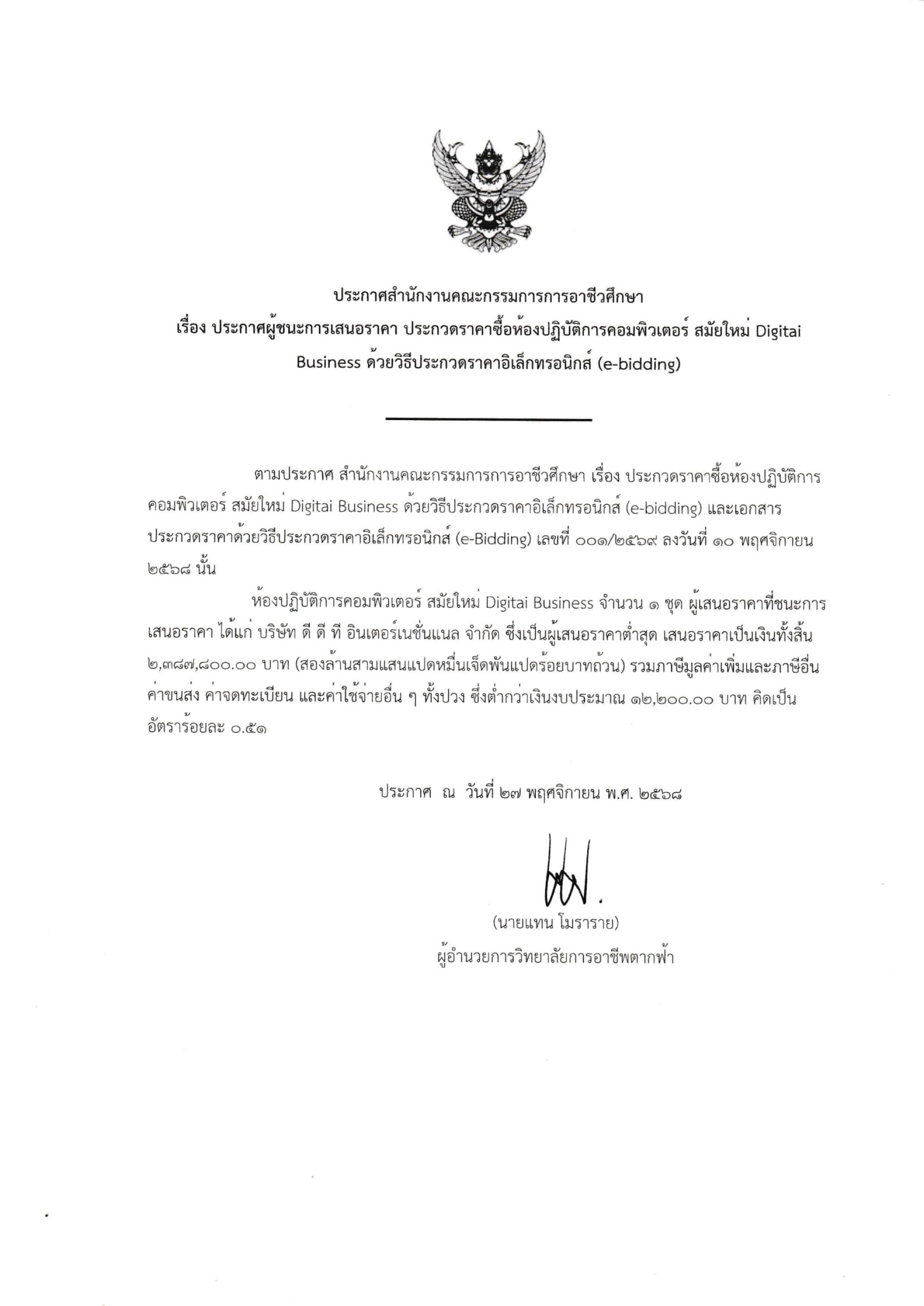 ประกาศผู้ชนะการเสนอราคา ประกวดราคาซื้อห้องปฎิบัติการคอมพิวเตอร์ สมัยใหม่ Digital Bussiness ด้วยวิธีประกวดราคาอิเล็กทรอนิกส์ e-bidding