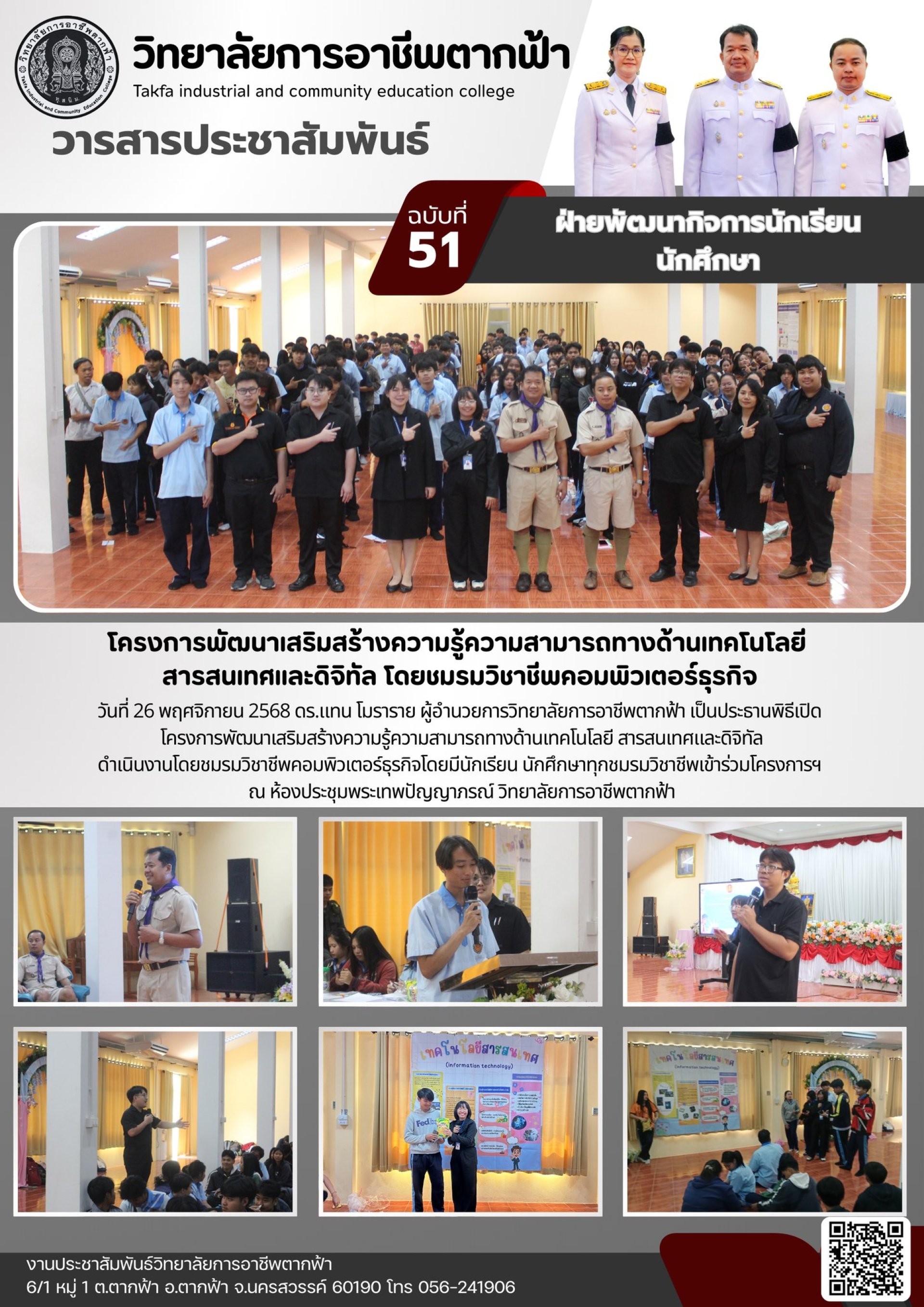 วารสารตากฟ้า ประจำเดือน พฤศจิกายน 2568 ฉบับที่ 51 โครงการพัฒนาเสริมสร้างความรู้ความสามารถทางด้านเทคโนโลยี สารสนเทศและดิจิทัล โดยชมรมวิชาชีพคอมพิวเตอร์ธุรกิจ