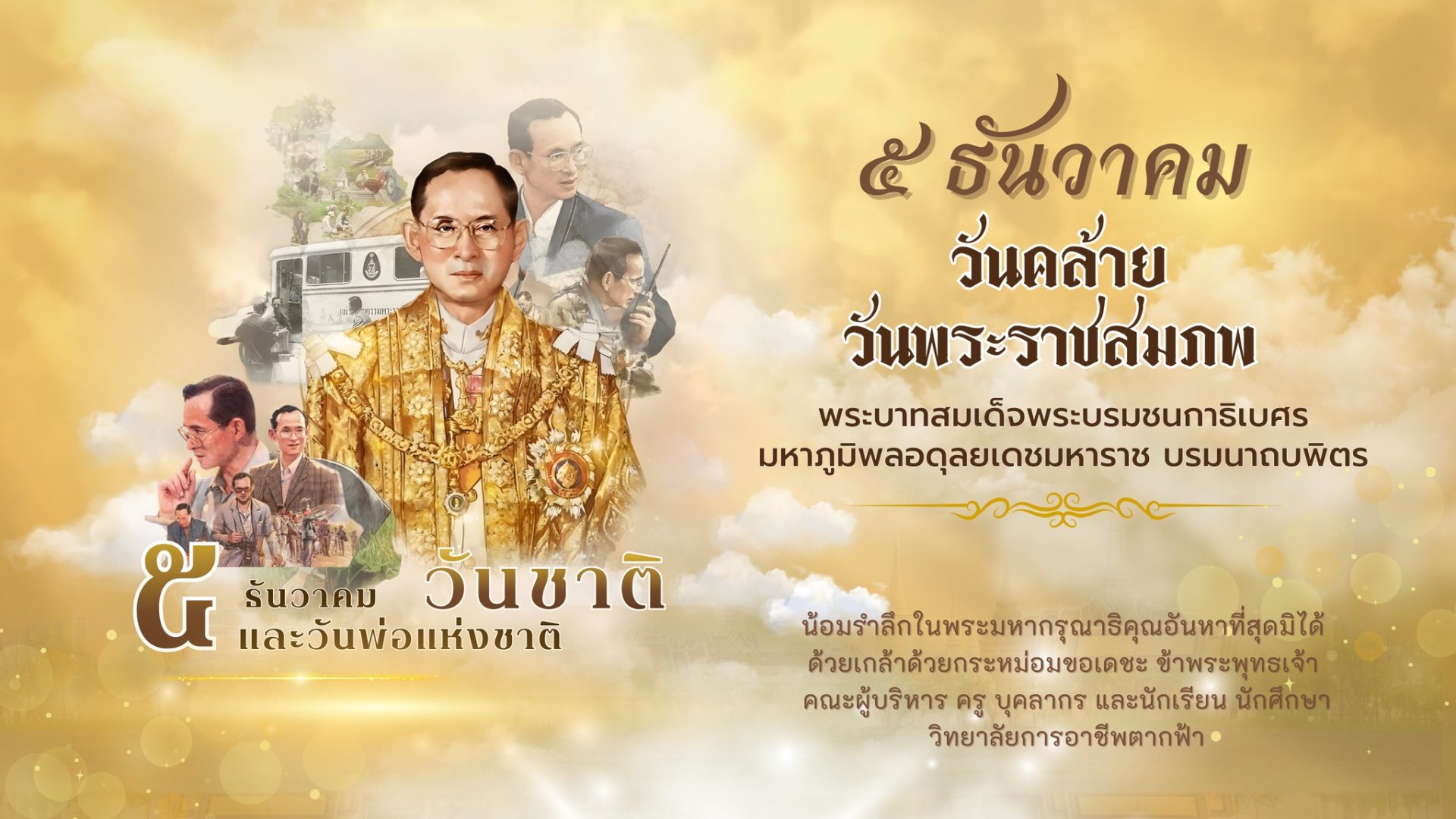 ๕ ธันวาคม วันคล้ายวันพระบรมราชสมภพ พระบาทสมเด็จพระบรมชนกาธิเบศร มหาภูมิพลอดุลยเดชมหาราช บรมนาถบพิตร วันชาติไทยและวันพ่อแห่งชาติ น้อมรำลึกในพระมหากรุณาธิคุณอันหาที่สุดมิได้ ข้าพระพุทธเจ้าคณะผู้บริหาร ครู บุคลากรทางการศึกษา และนักเรียน นักศึกษา วิทยาลัย