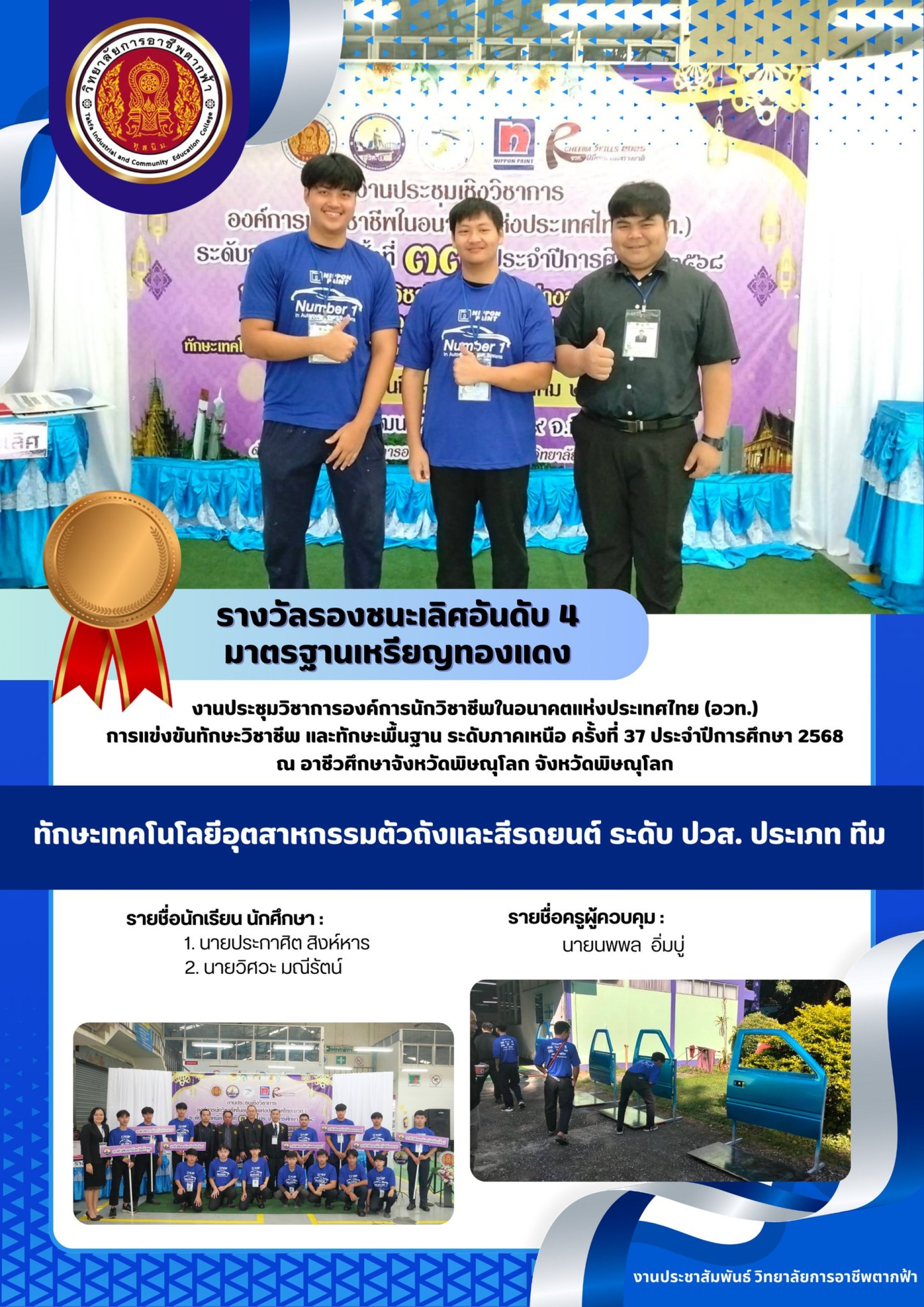 วิทยาลัยการอาชีพตากฟ้า ขอแสดงความยินดีกับคนเก่งตากฟ้า ได้รับรางวัล : รางวัลรองชนะเลิศอันดับ 4 มาตรฐานเหรียญทองแดง ทักษะ : ทักษะเทคโนโลยีอุตสาหกรรมตัวถังและสีรถยนต์ ระดับ ปวส. ประเภท ทีม งานประชุมวิชาการองค์การนักวิชาชีพในอนาคตแห่งประเทศไทย (อวท.) การแข่งข