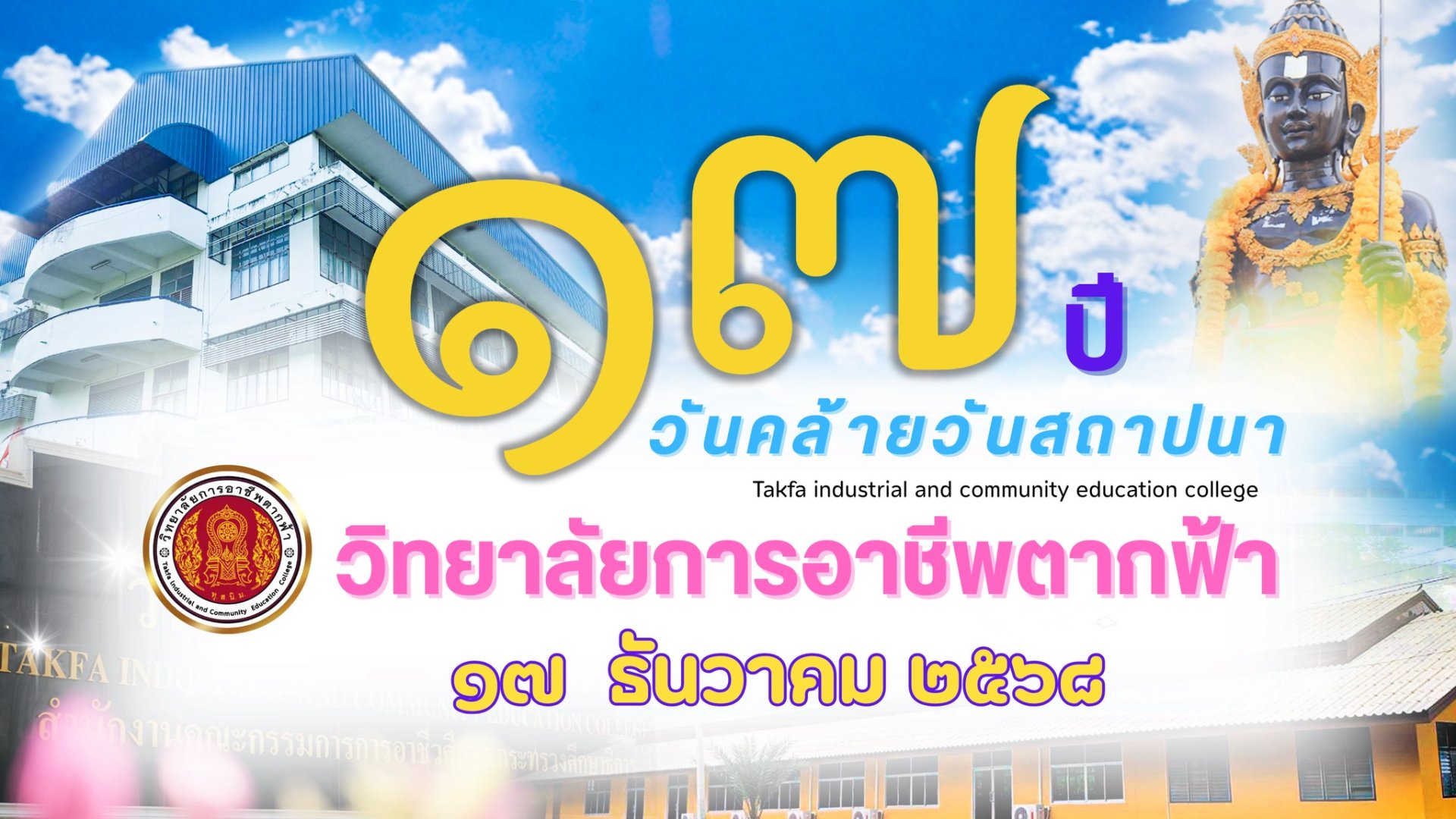 17 ธันวาคม 2568 วันคล้ายวันสถาปนา วิทยาลัยการอาชีพตากฟ้า วิทยาลัยการอาชีพตากฟ้า ขอร่วมรำลึกถึงวันแห่งความภาคภูมิใจ ตลอดระยะเวลาที่ผ่านมา วิทยาลัยฯ มุ่งมั่นพัฒนาการจัดการศึกษา สร้างโอกาส สร้างอาชีพ และผลิตกำลังคนคุณภาพสู่สังคมและชุมชน