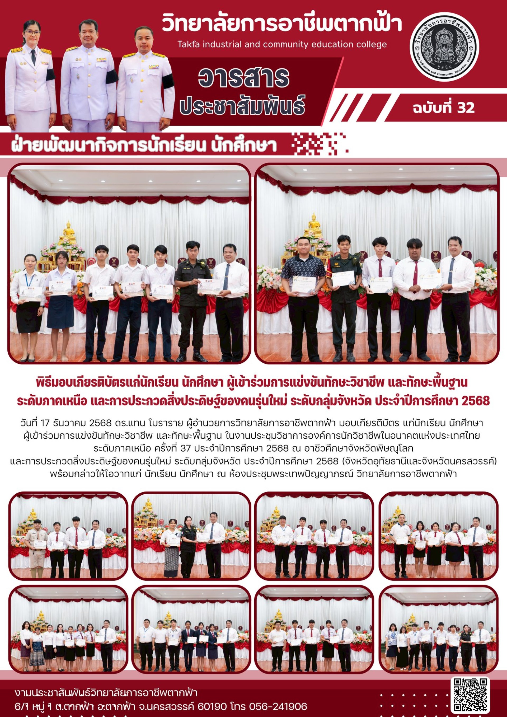 วารสารตากฟ้า ประจำเดือน ธันวาคม 2568 ฉบับที่ 32 พิธีมอบเกียรติบัตรแก่นักเรียน นักศึกษา ผู้เข้าร่วมการแข่งขันทักษะวิชาชีพ และทักษะพื้นฐาน ระดับภาคเหนือ และการประกวดสิ่งประดิษฐ์ของคนรุ่นใหม่ ระดับกลุ่มจังหวัด ประจำปีการศึกษา 2568