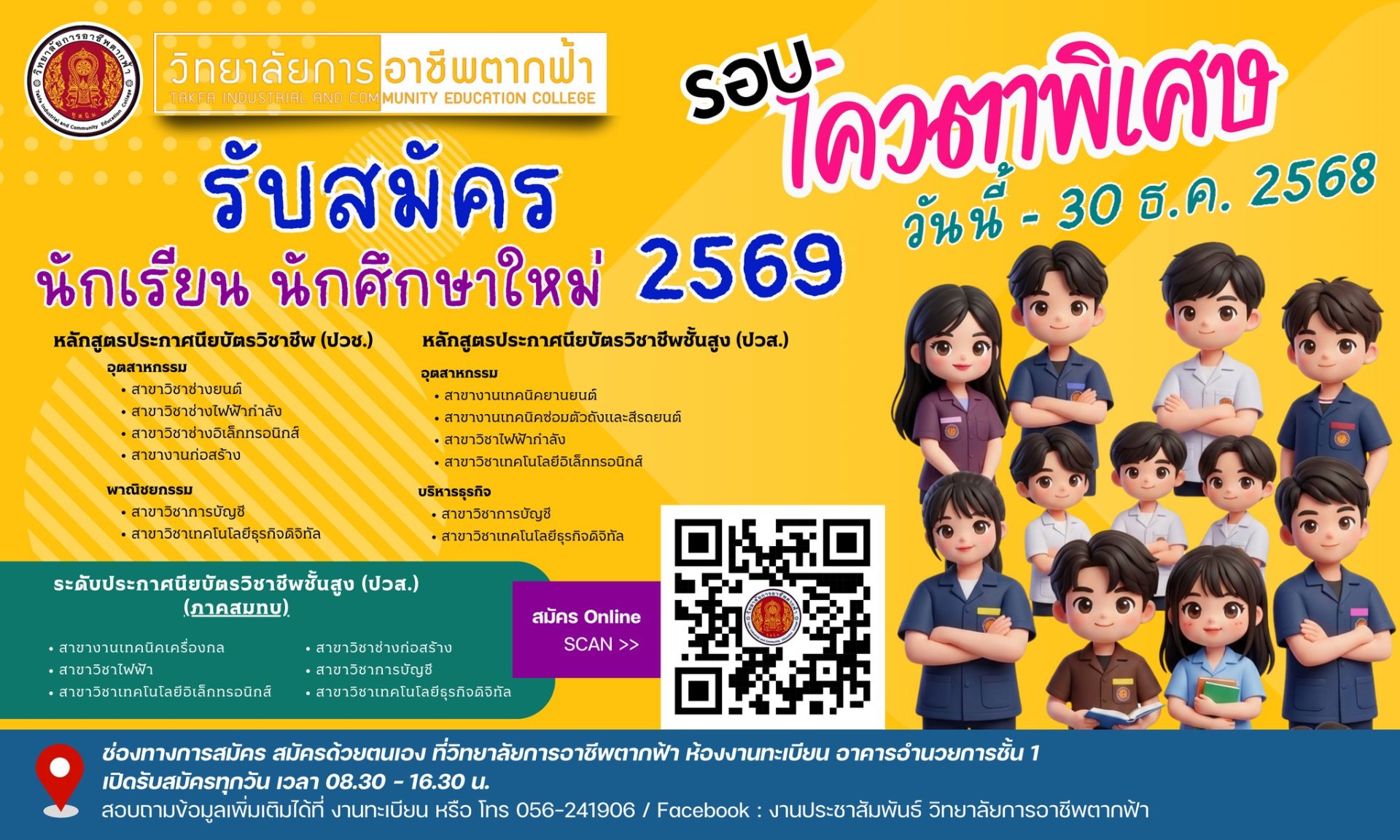 สมัครด้วยตนเองที่ งานทะเบียน วิทยาลัยการอาชีพตากฟ้า
