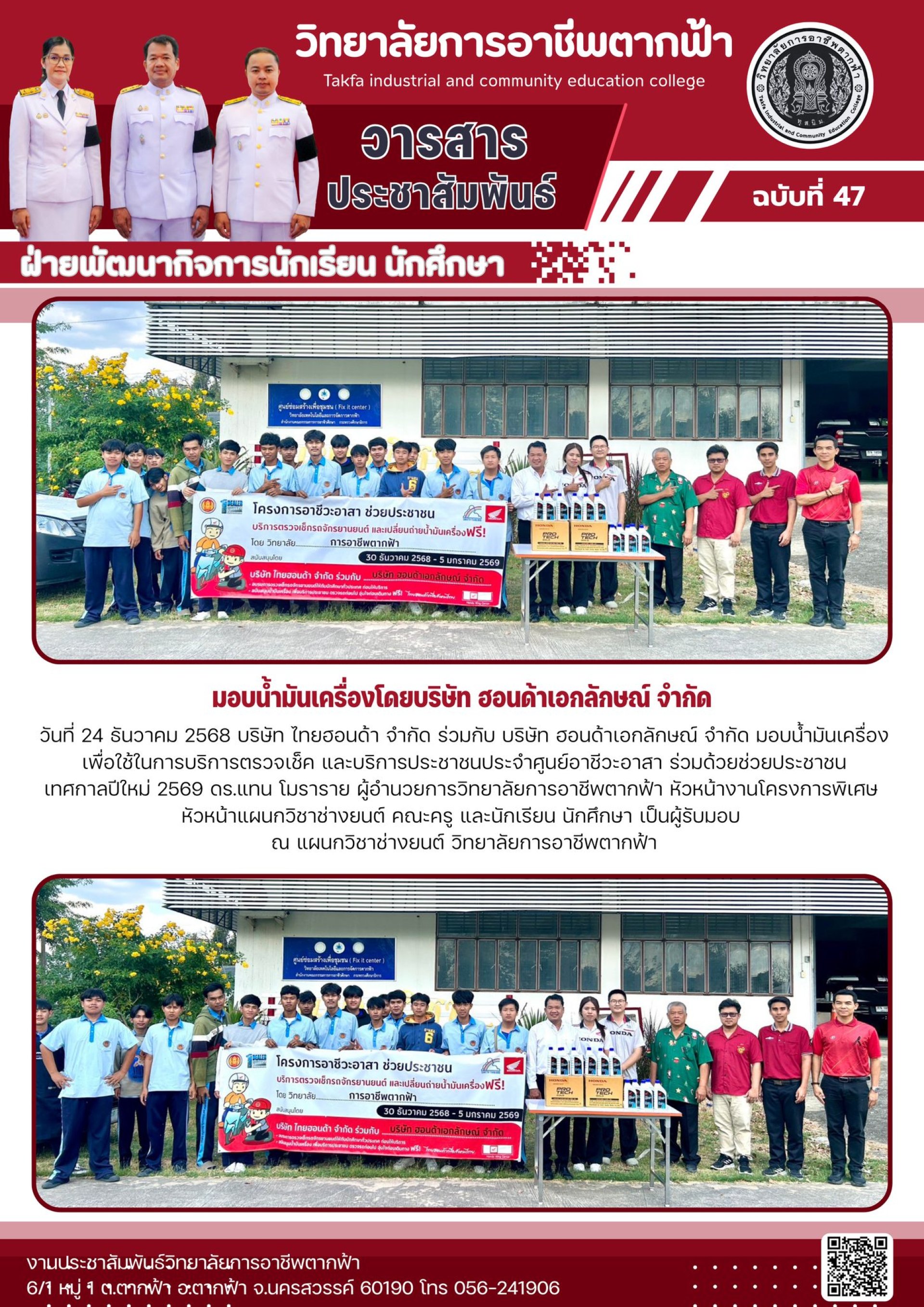 วารสารตากฟ้า ประจำเดือน ธันวาคม 2568 ฉบับที่ 47 มอบน้ำมันเครื่องโดยบริษัท ฮอนด้าเอกลักษณ์ จำกัด