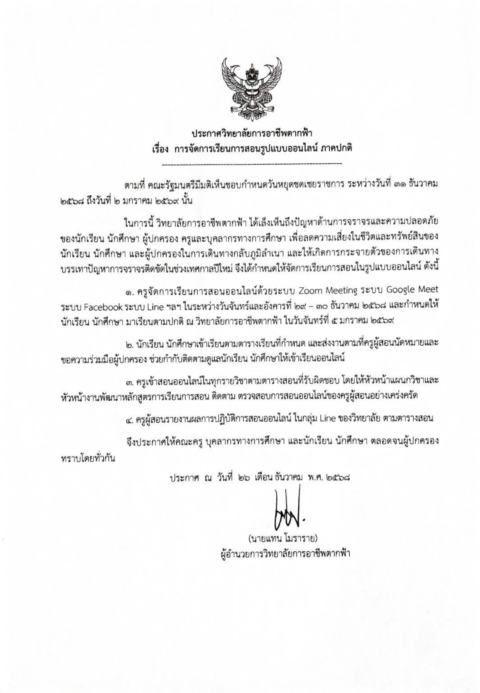 ประกาศวิทยาลัยการอาชีพตากฟ้า เรื่องการจัดการเรียนการสอนรูปแบบออนไลน์ภาคปกติ จัดการเรียนการสอนออนไลน์ ในวันที่ 29-30 ธันวาคม 2568 เปิดเรียนตามปกติวันจันทร์ที่ 5 มกราคม 2569